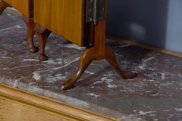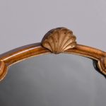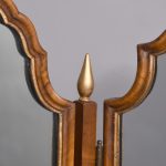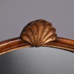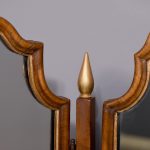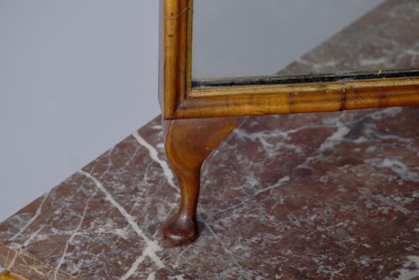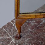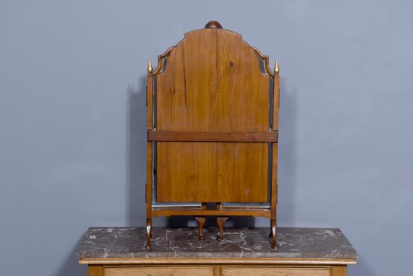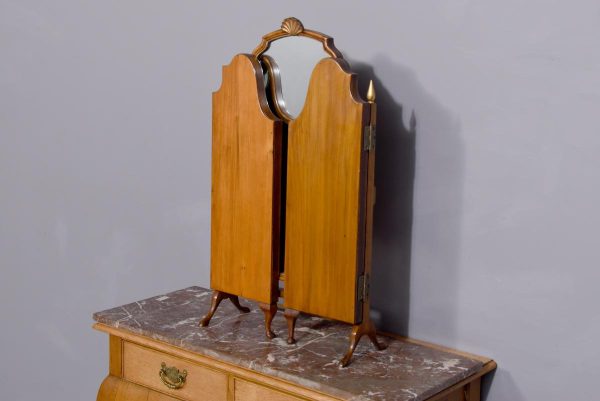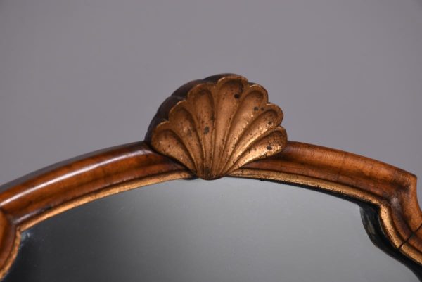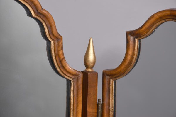 Circa 1900. Early Georgian-style figured walnut and gilded triptych dressing mirror. The central, wider mirror with an arched top and shell decoration, on rectangular supports with gilded finials, is flanked by two smaller shaped mirrors with moulded frames and gilded slips. All supported on small cabriole supports with pad feet. In perfect condition with a lovely mellow colour.