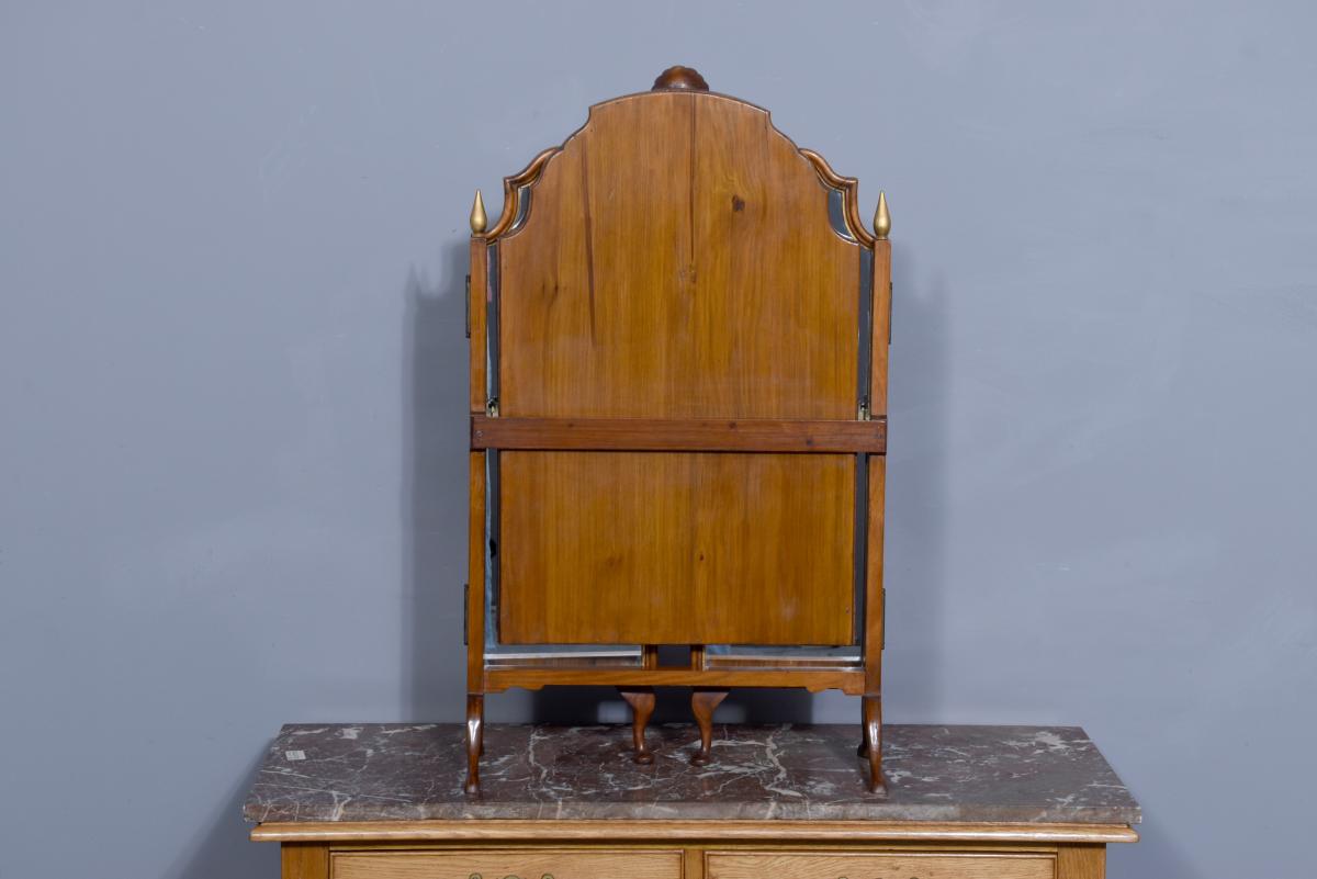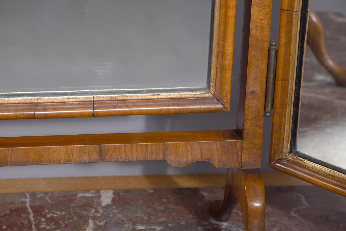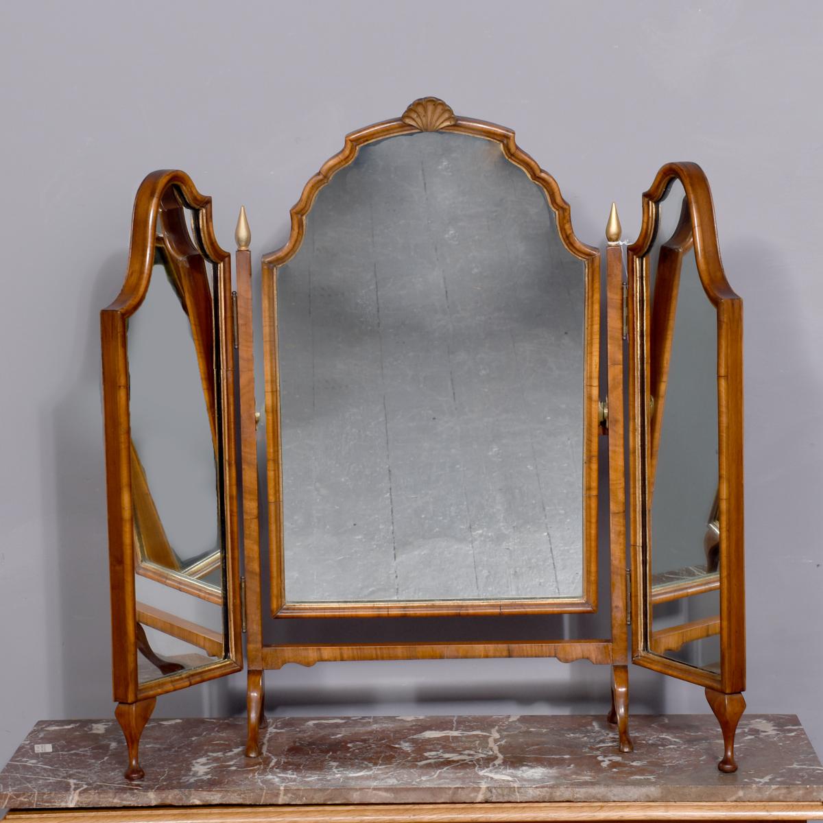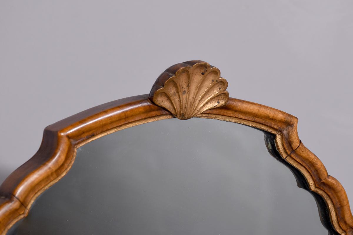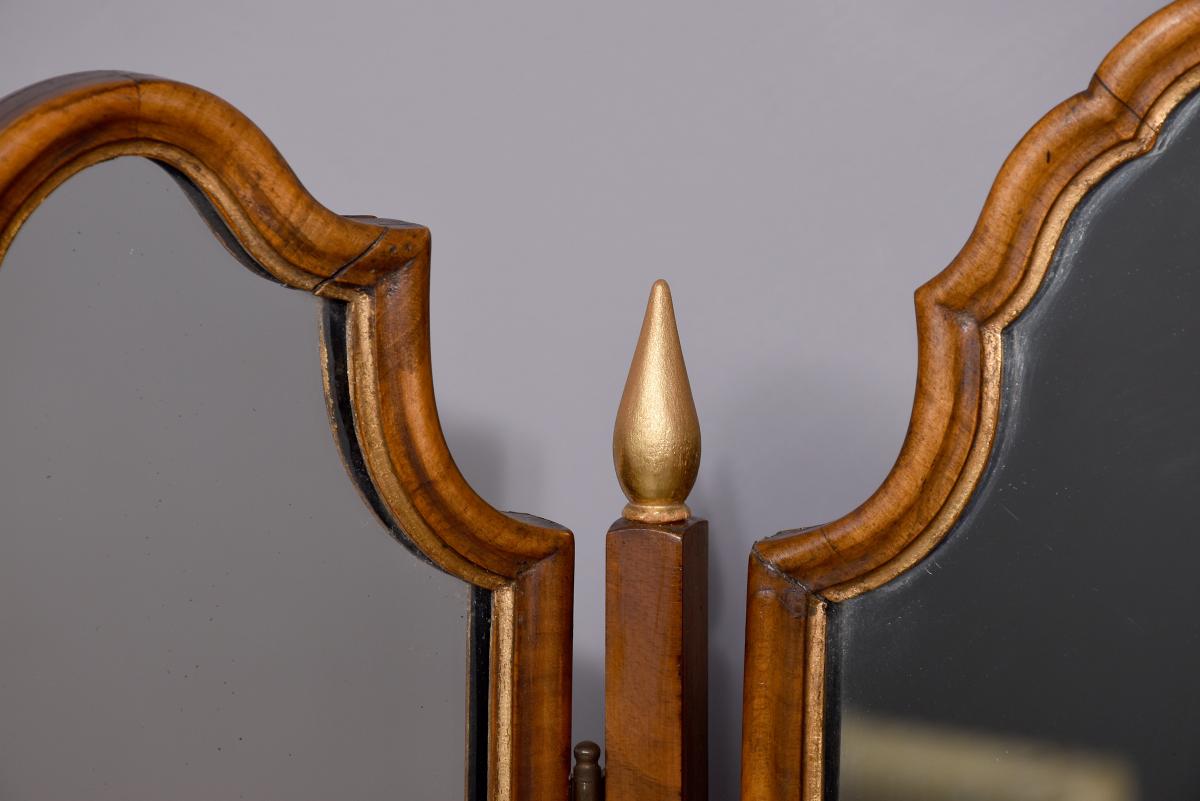 Circa 1900. Early Georgian-style figured walnut and gilded triptych dressing mirror. The central, wider mirror with an arched top and shell decoration, on rectangular supports with gilded finials, is flanked by two smaller shaped mirrors with moulded frames and gilded slips. All supported on small cabriole supports with pad feet. In perfect condition with a lovely mellow colour.