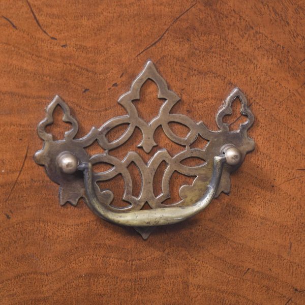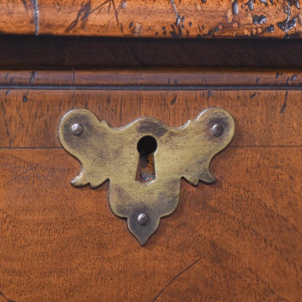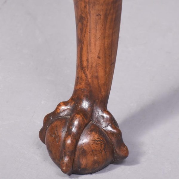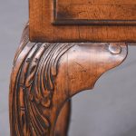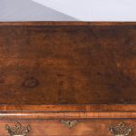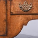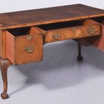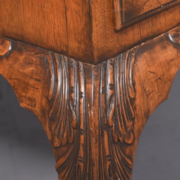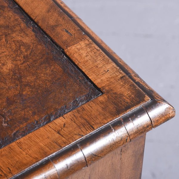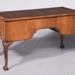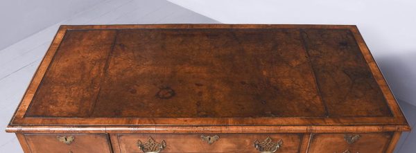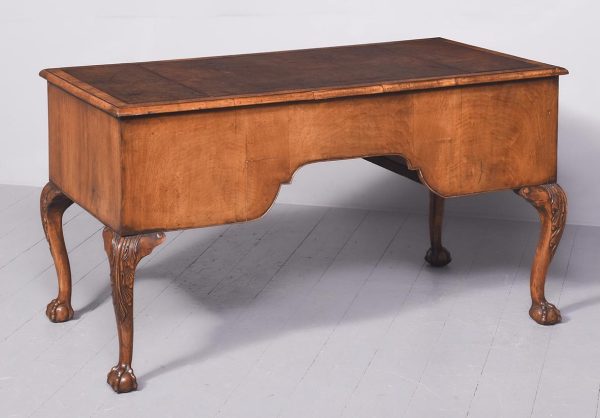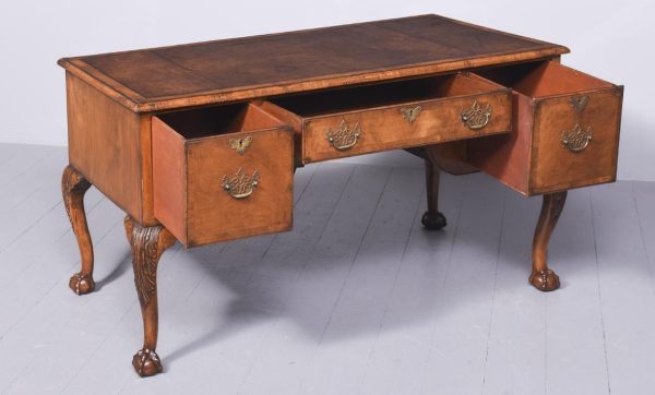 Circa 1900 Early Georgian-style, freestanding figured walnut writing desk. The rectangular top with crossbanding and a moulded edge and a tan leather surface over one long two deep frieze crossbanded drawers with cut fret brass handles and escutcheons and heavy solid mahogany drawer linings (sign of quality cabinetmaking) over a beaded apron. All supported on carved cabriole legs with acanthus carved knees and ball and claw feet.