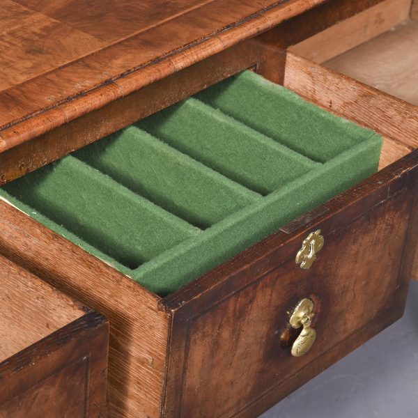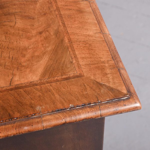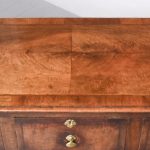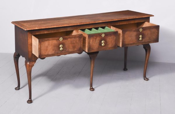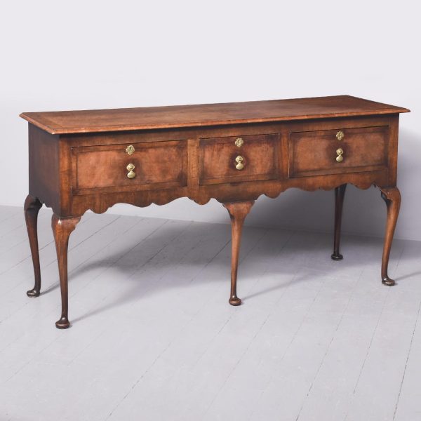 Circa 1910. Early Georgian style inlaid figured walnut dresser base. The rectangular top with mirror matched figured walnut, herringbone inlay and crossbanding and with moulded edges above 3 inlaid and crossbanded frieze drawers with solid oak drawer linings, brass drop handles and cut brass escutcheons supported on 5 cabriole legs terminating on pad feet. Lovely mellow colour and patina.