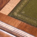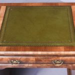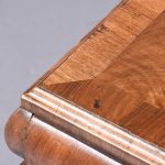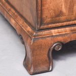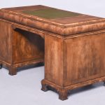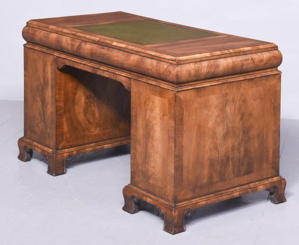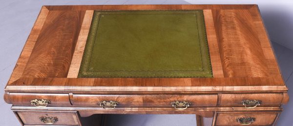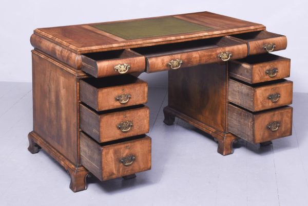 Circa 1920. Early Georgian-style walnut freestanding kneehole writing desk. The crossbanded top with a tooled, brown leather writing surface and walnut panels to the sides above 3 Bombe-front frieze drawers with cast brass Georgian-style handles. Supported on banks of 3 crossbanded drawers with matching brass handles over moulded bases and shaped ogee bracket feet. The sides and the back with panels of mirror matched crossbanded walnut.