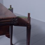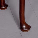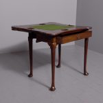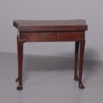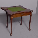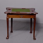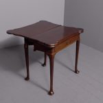 Circa 1760 an early George III mahogany triple top card tea games table, the shaped tops are hinged, inside the first one is a polished mahogany surface(tea table), the second one is lined in baize(card table) with four oval guineas wells, the two back legs are hinged and swing out to support the tops when open, the simple frees at the front with a full length drawer, all resting on four lapped club legs finishing on a simple pad foot.