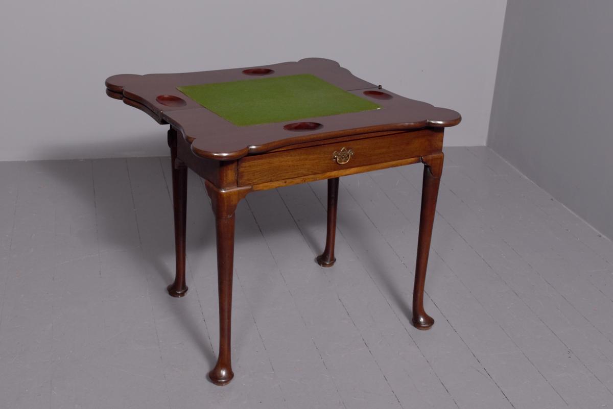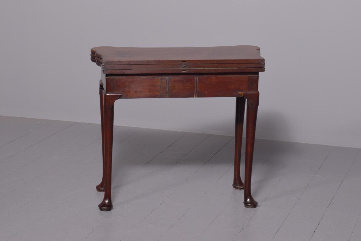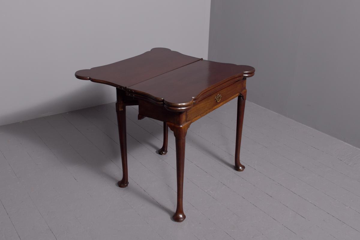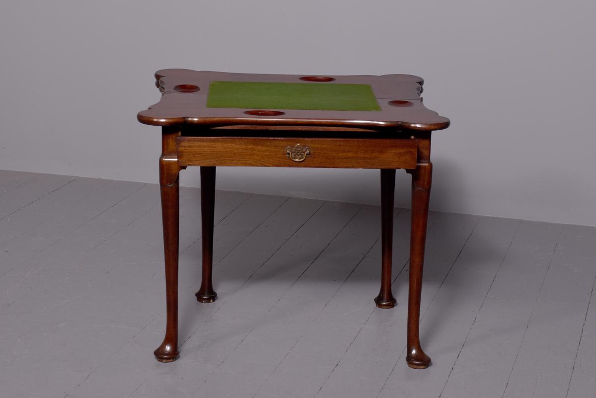 Circa 1760 an early George III mahogany triple top card tea games table, the shaped tops are hinged, inside the first one is a polished mahogany surface(tea table), the second one is lined in baize(card table) with four oval guineas wells, the two back legs are hinged and swing out to support the tops when open, the simple frees at the front with a full length drawer, all resting on four lapped club legs finishing on a simple pad foot.