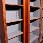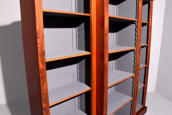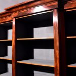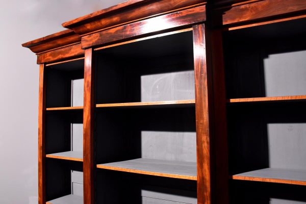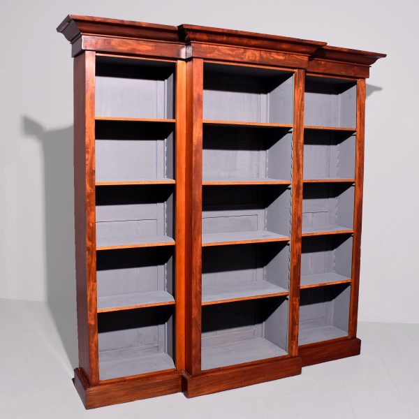 Circa 1840 with alterations. Early Victorian breakfront mahogany open bookcase. Surmounted by a molded cornice over a beaded frieze; with 2 shallower open bookcases at the side and a deeper bookcase more centrally, each with 4 adjustable crossbanded mahogany shelves, all flanked by simple mahogany pilasters and supported on a molded breakfront base. In excellent condition.
