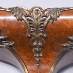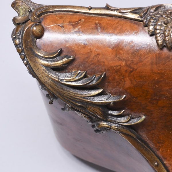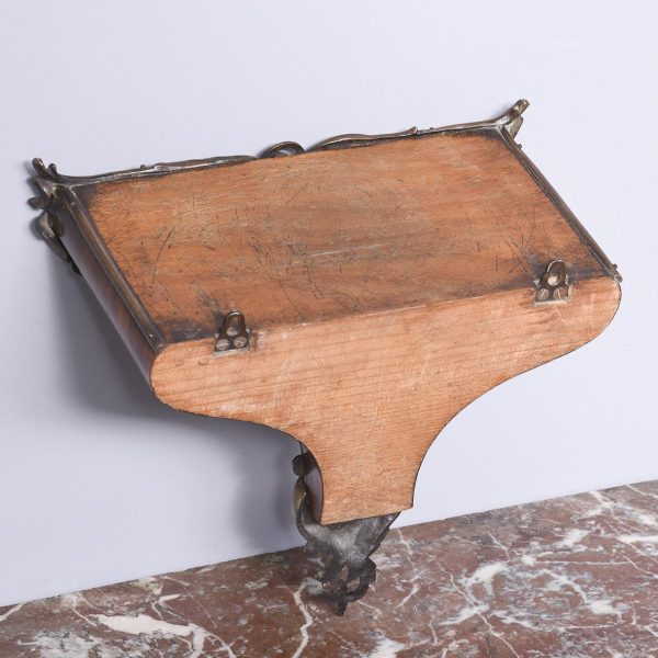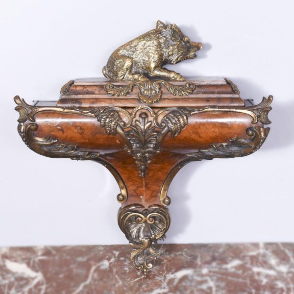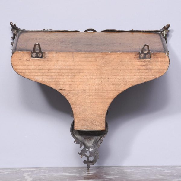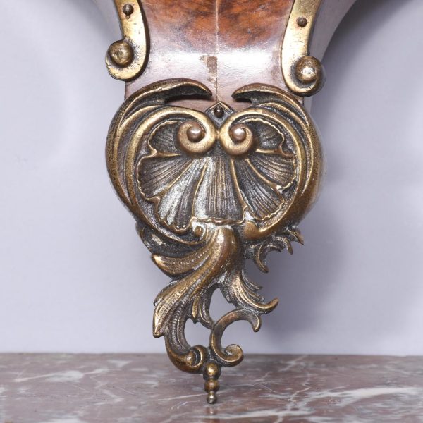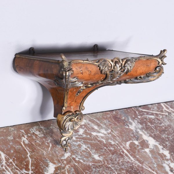 Circa 1840. Early Victorian figured walnut ormolu mounted wall bracket. The shaped bracket with extensive neo classical acanthus, shell and rococo cast brass mounts and the top surrounded by a low brass gallery. Lovely colour and patina.