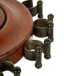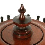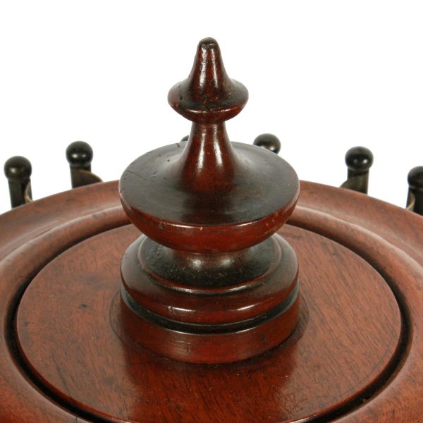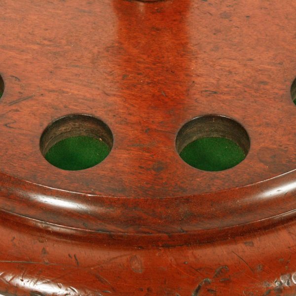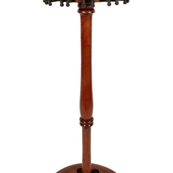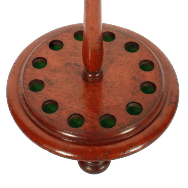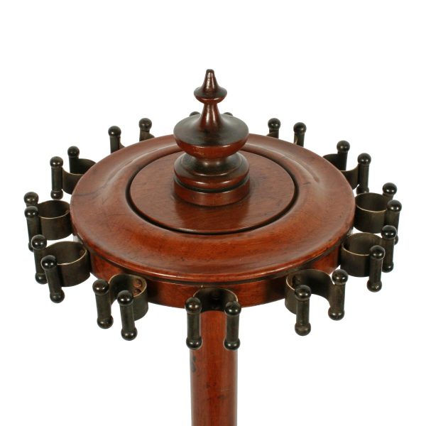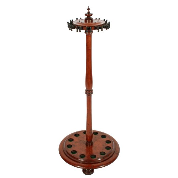 Circa 1860. An early Victorian turned mahogany billiard/snooker cue stand, the central stem surmounted with an elegant finial with a turned circular top holding brass sprung clips with small apertures in the large circular base with the capacity to hold 12 cues, all raised on three bun feet, the interiors of the sockets have been re-baized.