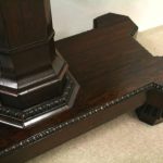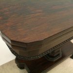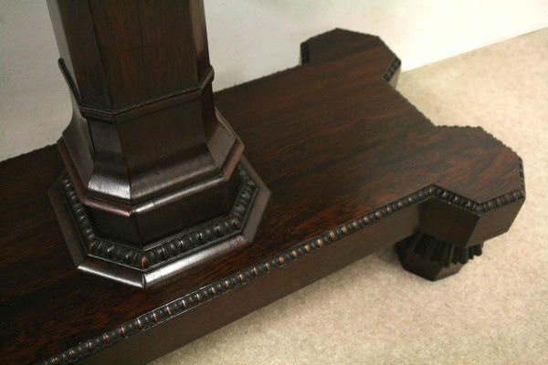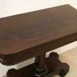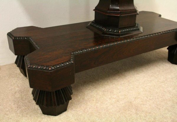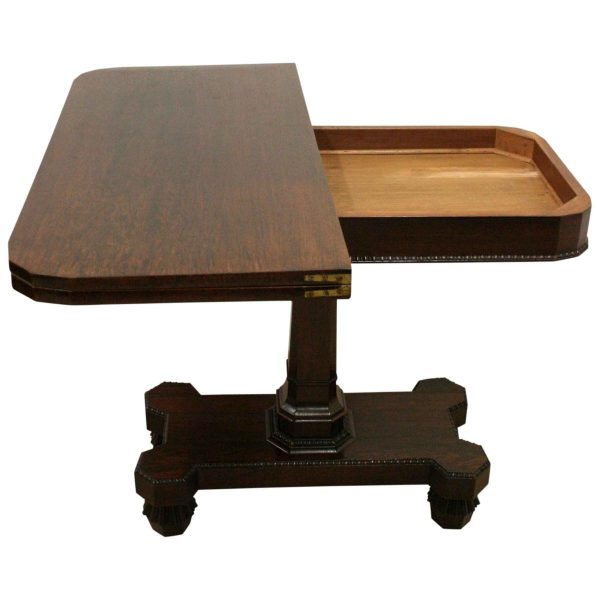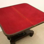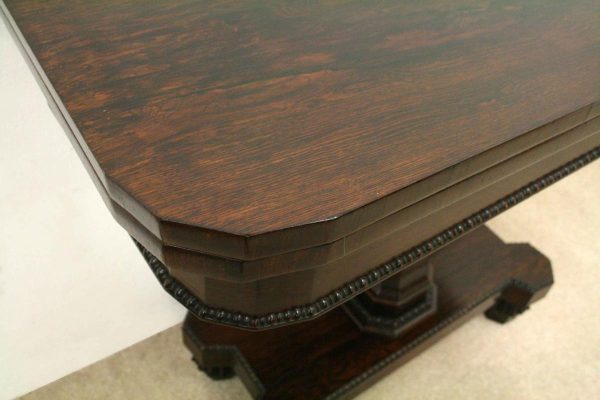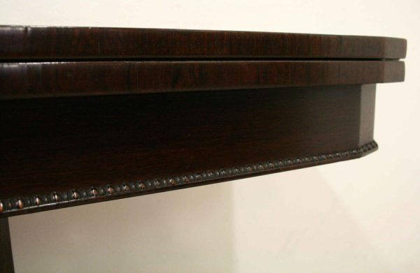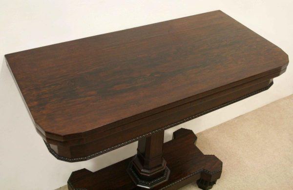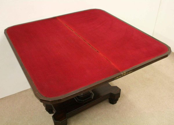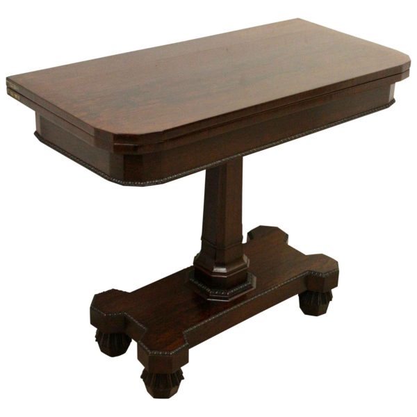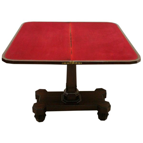 Circa 1850, early Victorian rosewood games table with unusual faceted corners to front and beaded decoration to frieze, standing on a tapered stem above a shaped platform base with beaded decoration, on fluted supports.