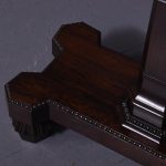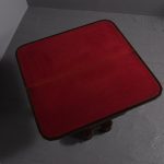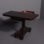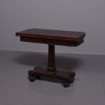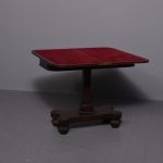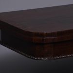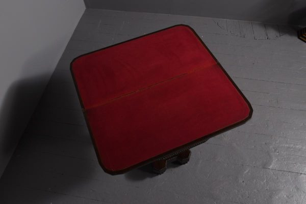 Circa 1850. Early Victorian rosewood games table with unusual faceted corners to front and beaded decoration to frieze, standing on a tapered stem above a shaped platform base with beaded decoration, on fluted supports.