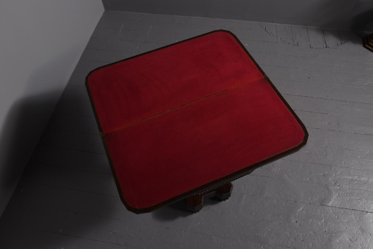 Circa 1850. Early Victorian rosewood games table with unusual faceted corners to front and beaded decoration to frieze, standing on a tapered stem above a shaped platform base with beaded decoration, on fluted supports.
