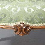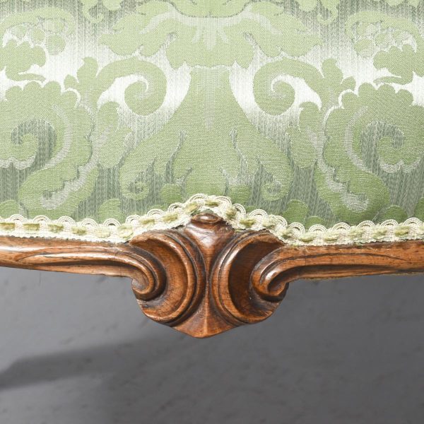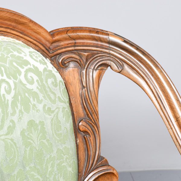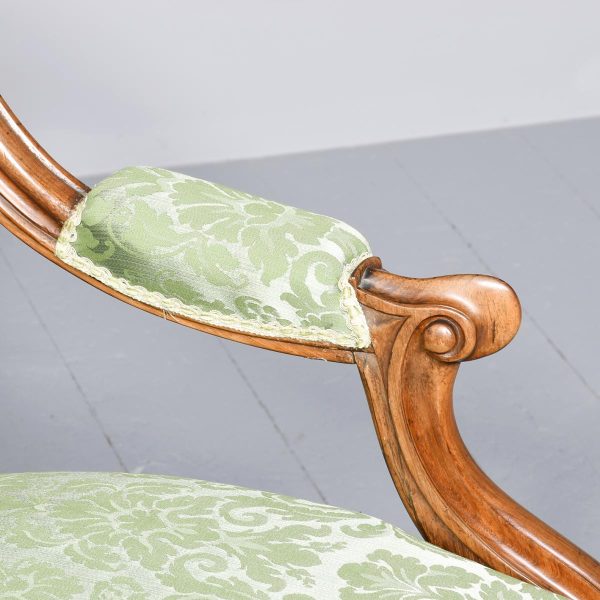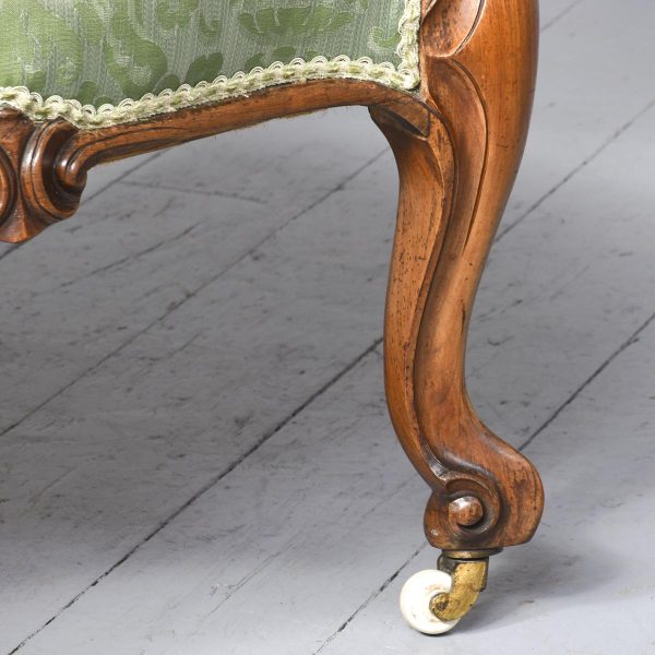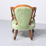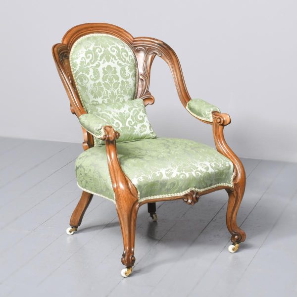 Circa 1860. An early Victorian rosewood ladies chair. The solid shaped frame, with shaped cresting rail, pierced areas and padded back, with shaped arms which finished with a well carved scroll facing. Large upholstered stuffed oval seat, back legs slightly out swept, a shaped and foliate carved apron to the front, finishing on an elegant leg with a curled toe with brass and white porcelain casters beneath. The chair comes with a small cushion, and the fabric is in excellent condition.