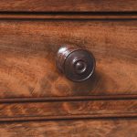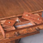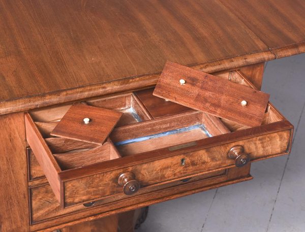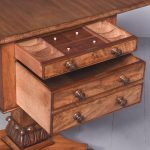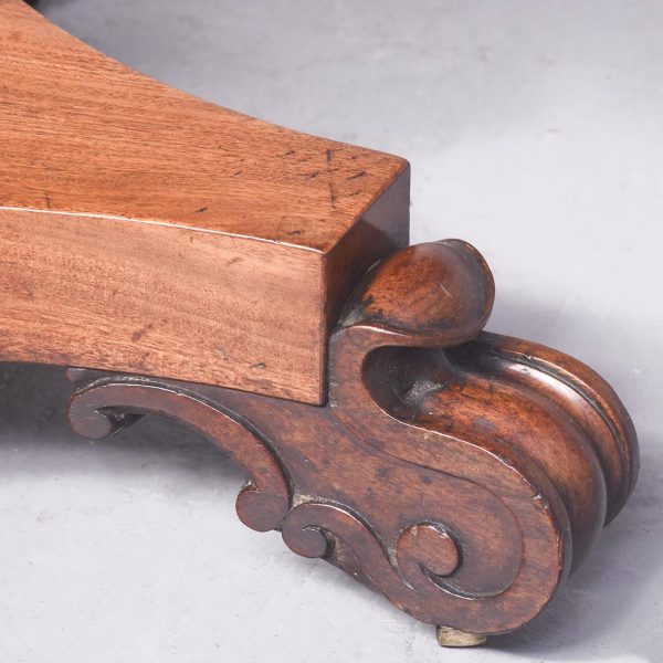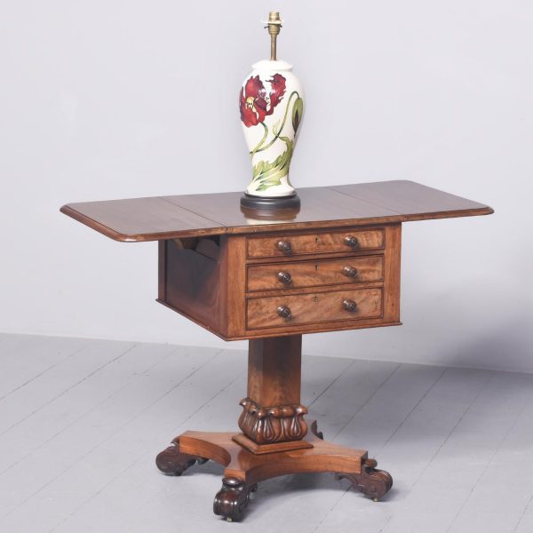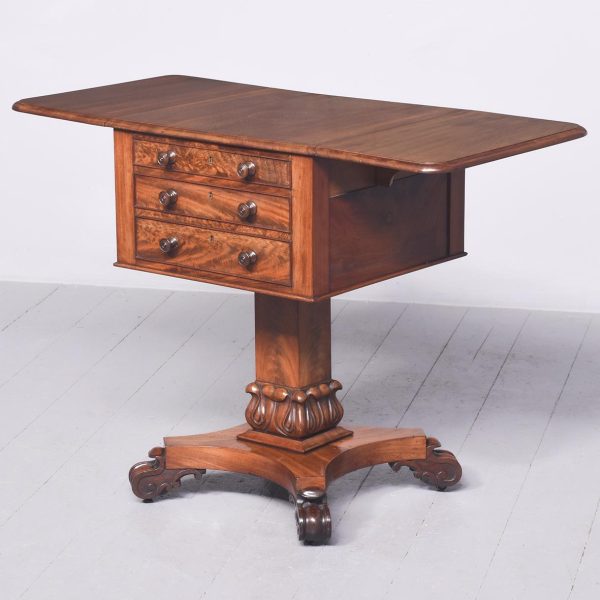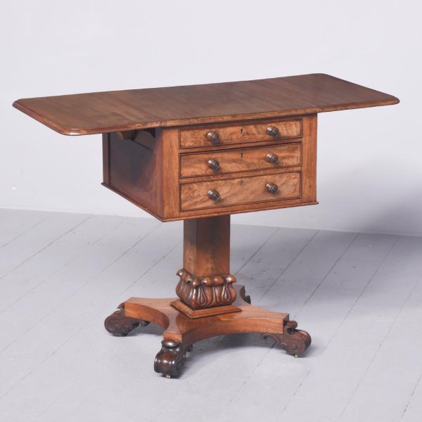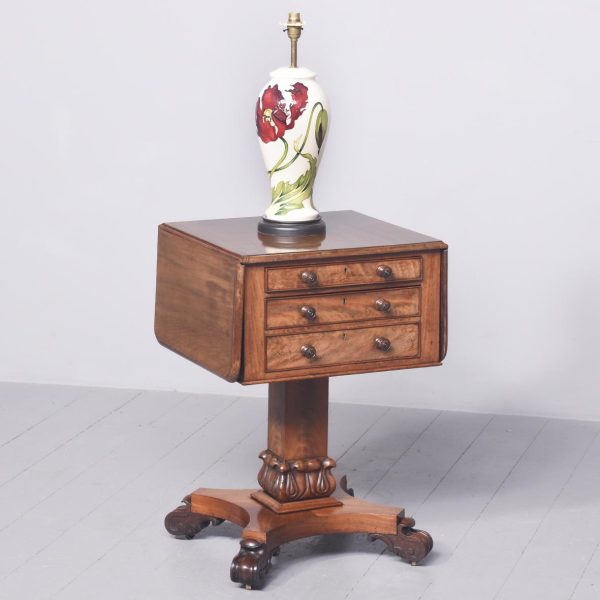 Circa 1840. Early Victorian/ William IV mahogany lampstand/worktable. The top in beautifully figured mahogany with folding side leaves; the front with fitted drawers with original turned bun handles; supported on a square column, with acanthus carved base over a quadripartite raised base on scrolled feet with hidden original castors.