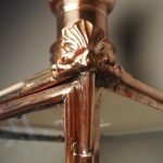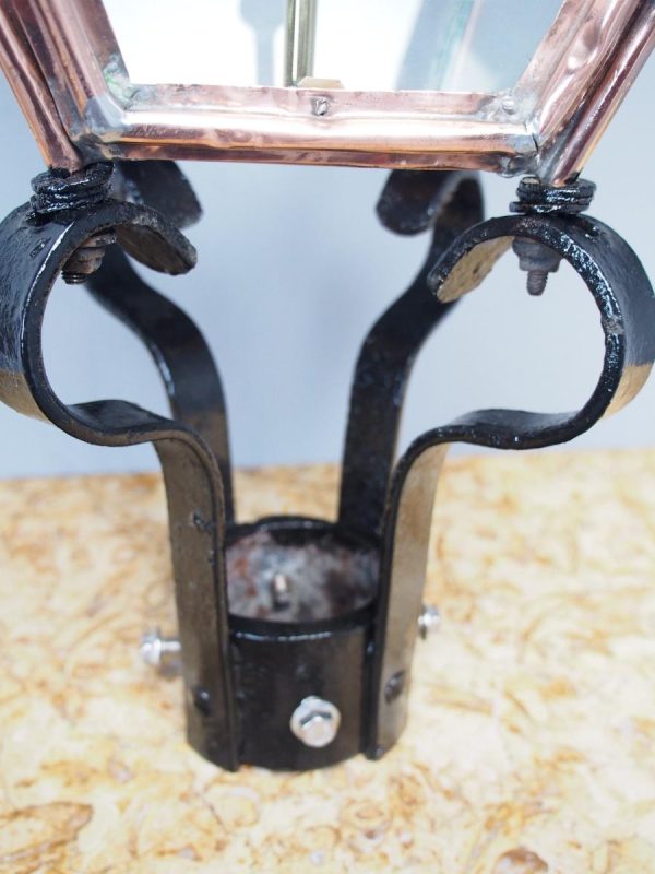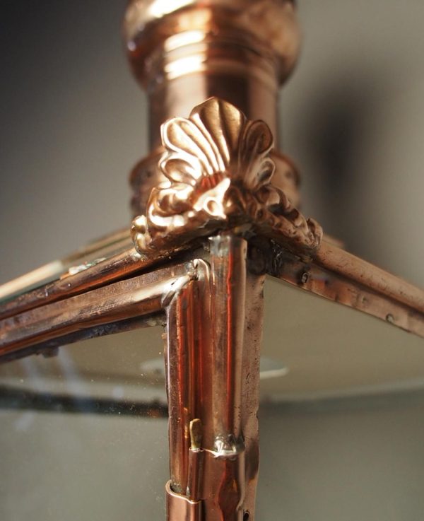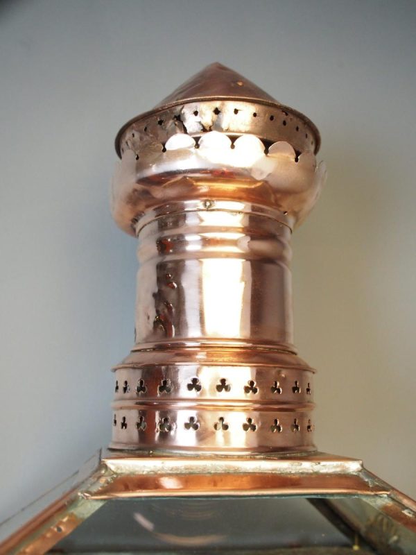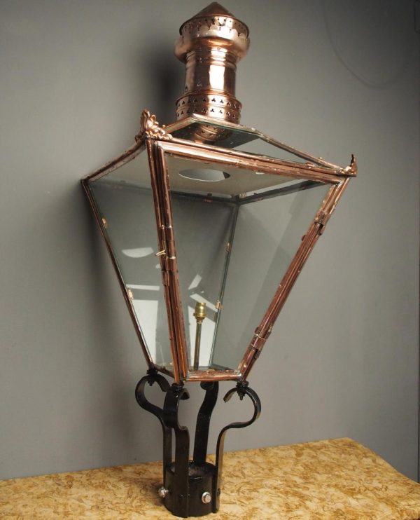 Circa 1850, Edinburgh copper and steel street lamp (also called a Lord Provost Lamp – due to its shape). Surmounted by a finial over a pierced, conical section and tapering square body glazed on all sides. The base with circular iron mount; recently cleaned and re-wired.