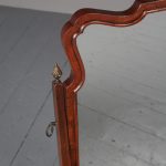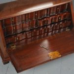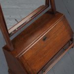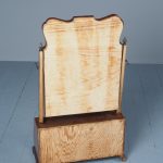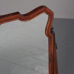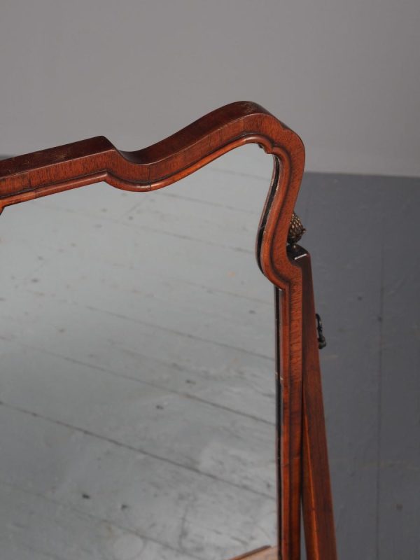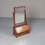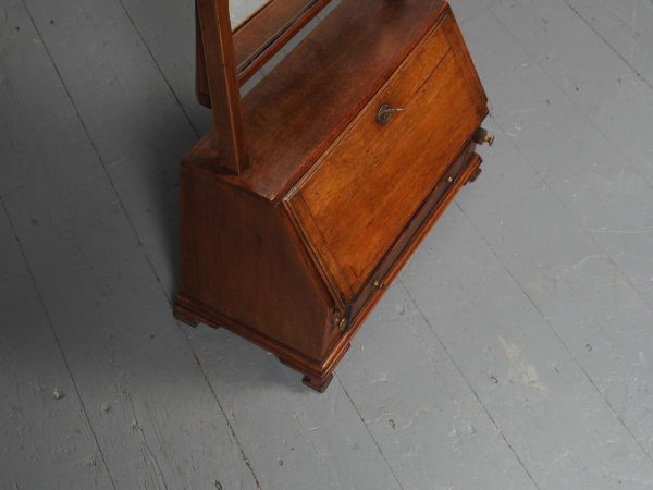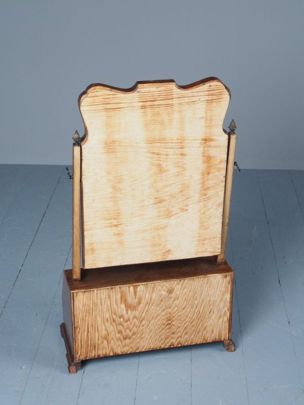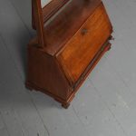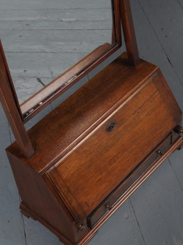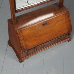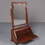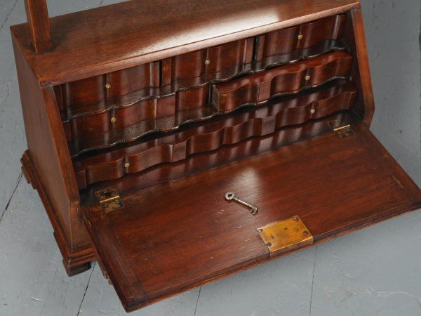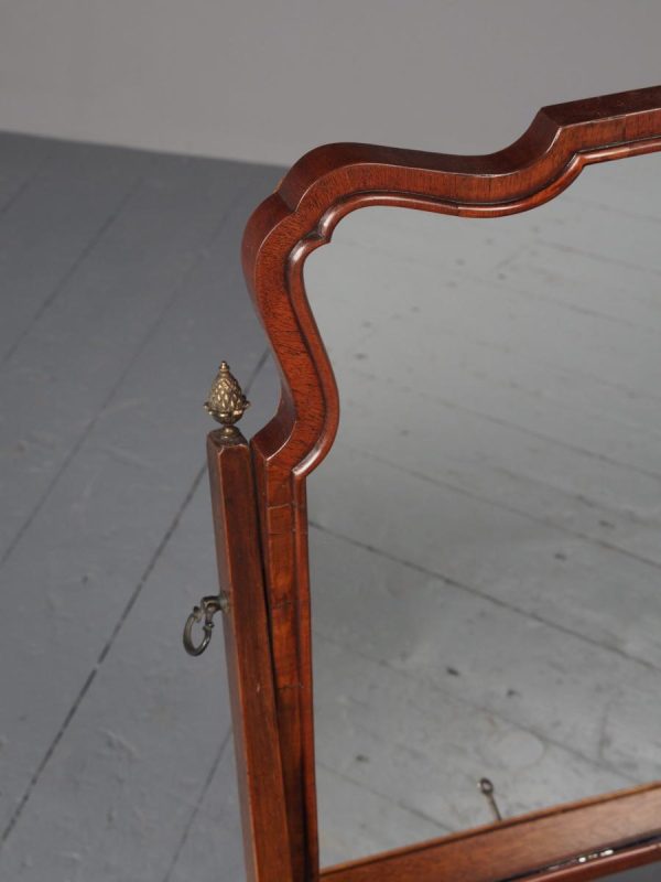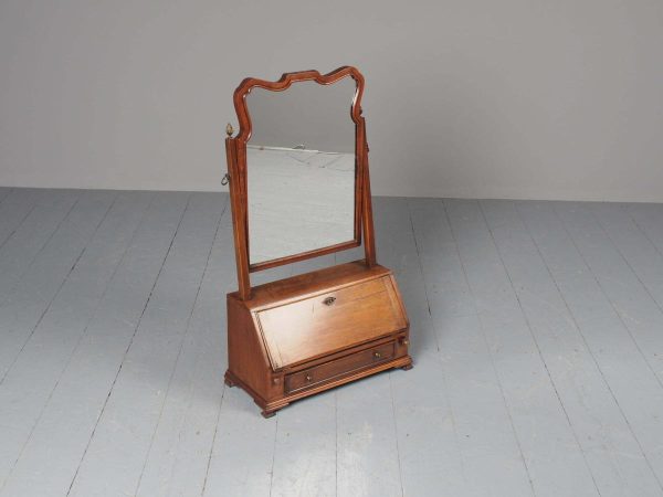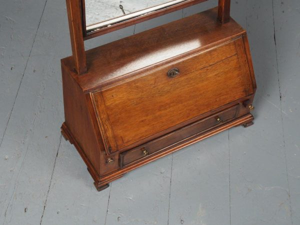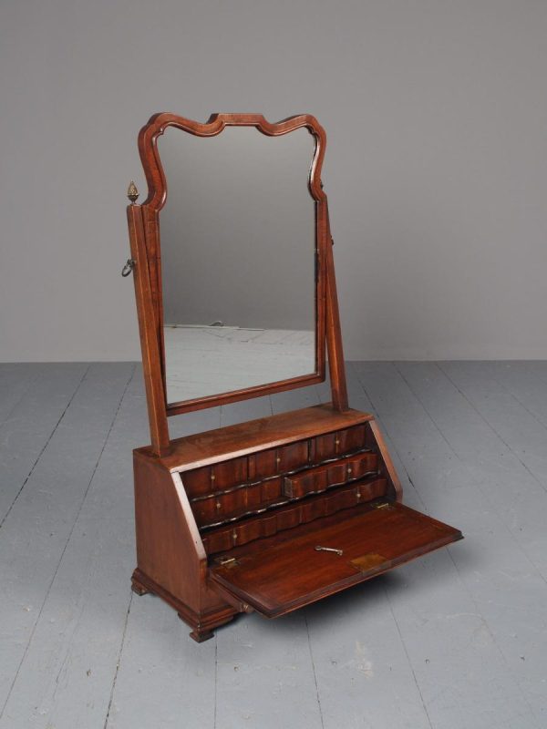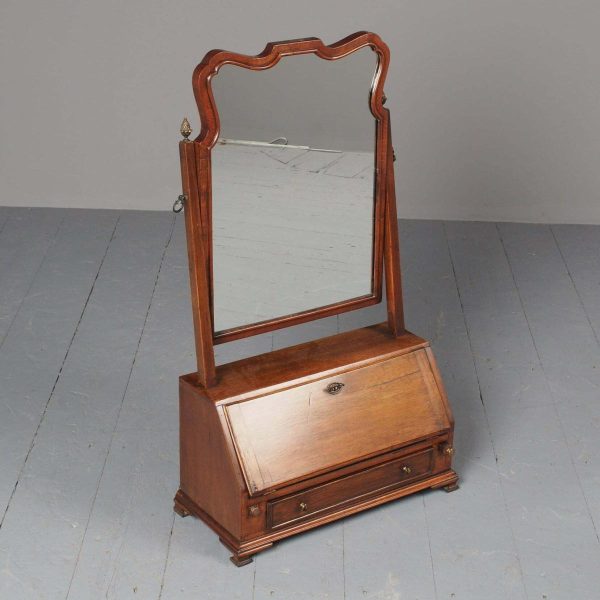 Circa 1900, Edwardian mahogany dressing mirror. The base in the style of a George II mahogany bureau with a drop down flap showing tiers of shaped-front jewellery drawers with bone handles, over a long drawer with brass handles flanked by lopers. All on a moulded base with shaped ogee bracket feet. The shaped mirror on tapering rectangular supports surmounted by brass pineapple finials.