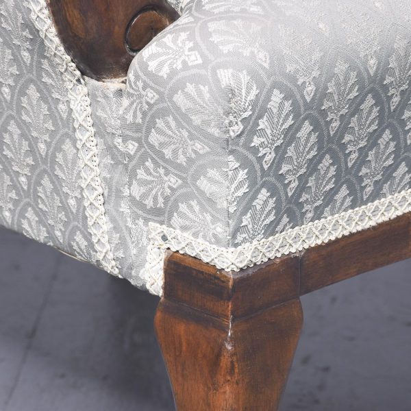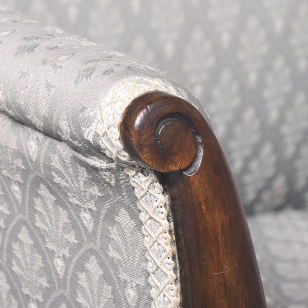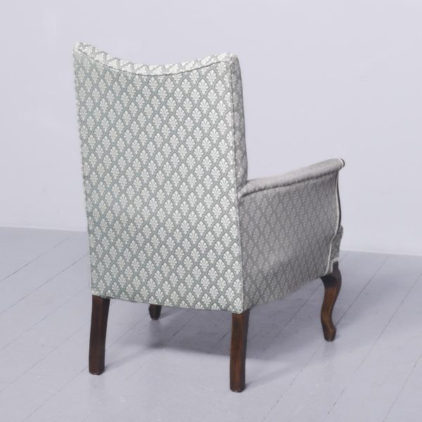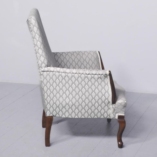 Circa 1900 Edwardian mahogany-framed easy chair with quality new tapestry upholstery. The shaped and sloped back above the upholstered arms with show wood in front of arms and the generous-sized serpentine fronted seat. With cabriole legs in front and square shaped rear supports. The upholstery and tapestry covering, with piping in excellent condition.