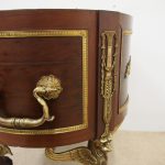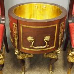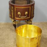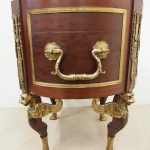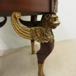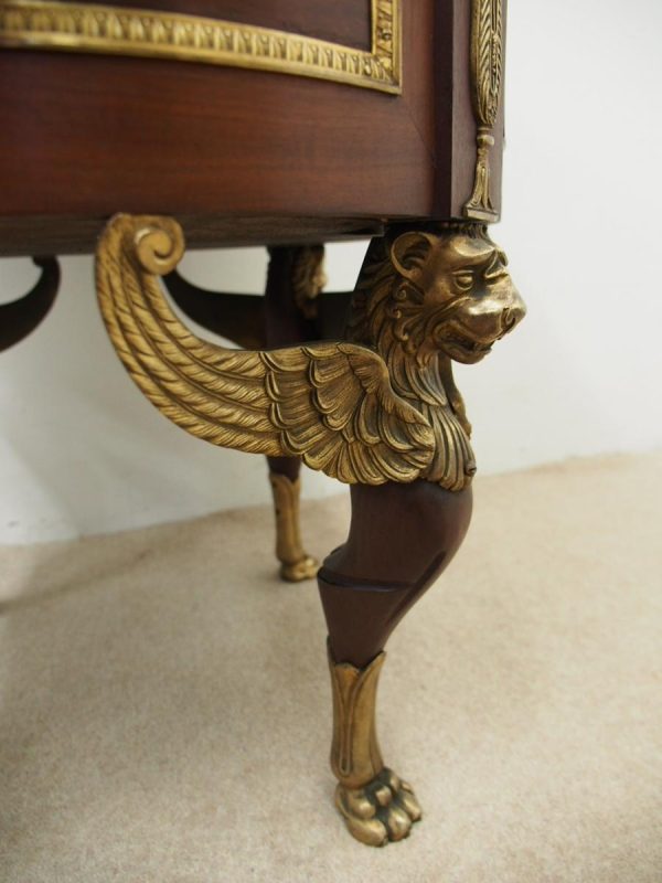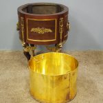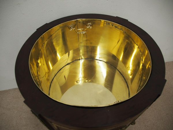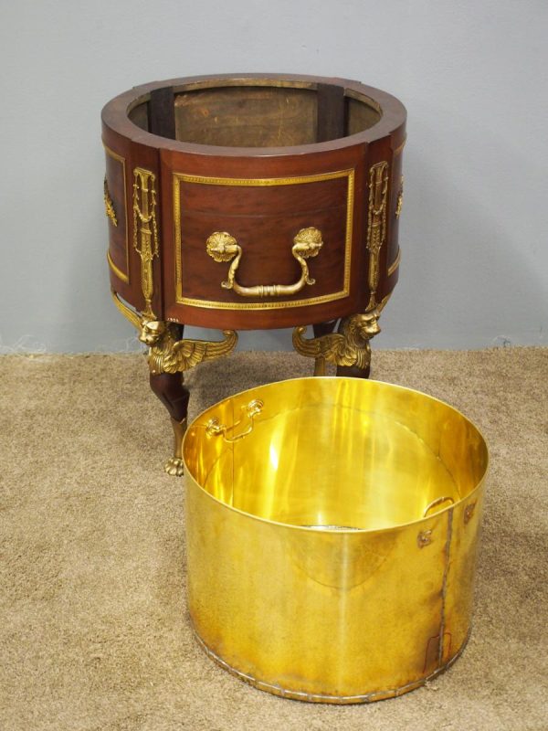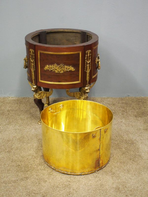Circa 1900, large Empire Revival mahogany and ormolu mounted circular jardiniere. With a brass lining, that was recently made to its exact specifications. The main body has 4 panels, with 2 large well cast lifting handles with acanthus leaves to the side and a carved cast flower head to the back plate, with a central drop section. This is held in the fielded panel with fine ormolu beading in a stylish pattern, and continues across the piece. The 2 panels without lifting handles have a large motif of flowers, and flowering fruit. Between each of the panels there is a cast upright in the form of a vase with swags and tails falling from the top down. The jardiniere stands on 4 legs, each of them in the form of a winged lion on a podium with a cast head, wings and mahogany body. It is shaped and curved and standing on a stylish animalistic foot. There is an inventory number on one of the facings ‘X954’. The jardiniere liner is removable and is water tight so can be used for flowers or as a wine cooler.