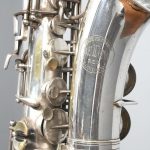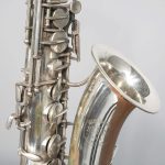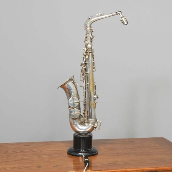 Circa 1920s, London made (Beltona) EPNS saxophone recently converted into a lamp. Sitting on a Victorian circular ebonised base, the mouth piece is now a lamp holder.