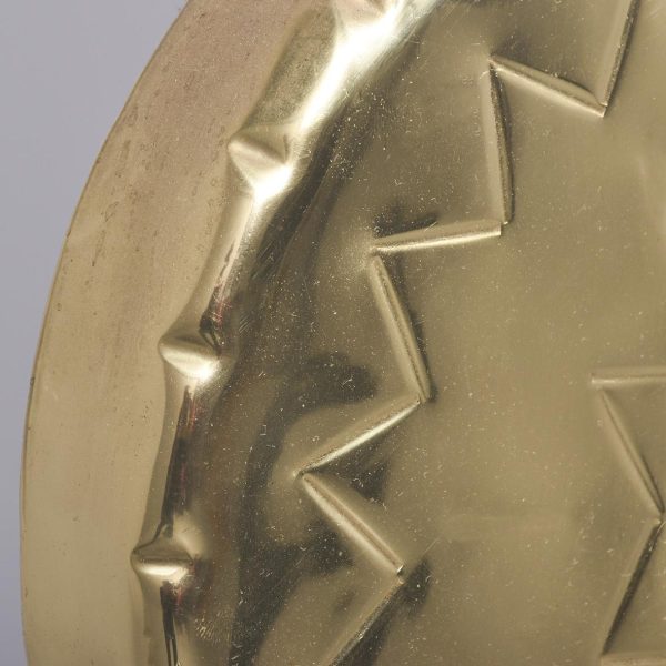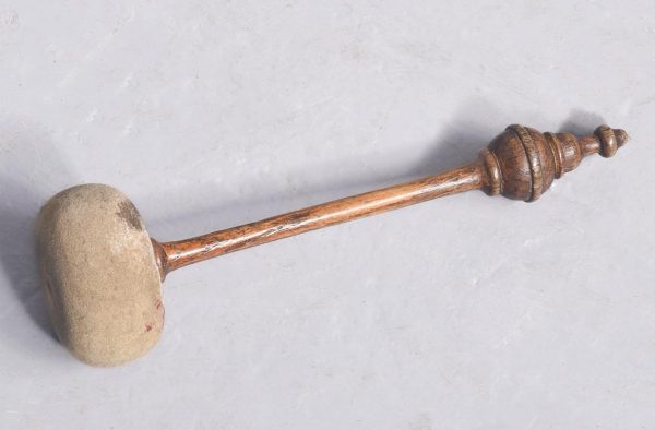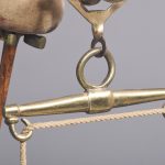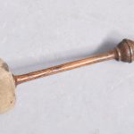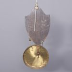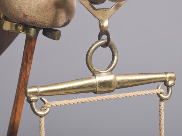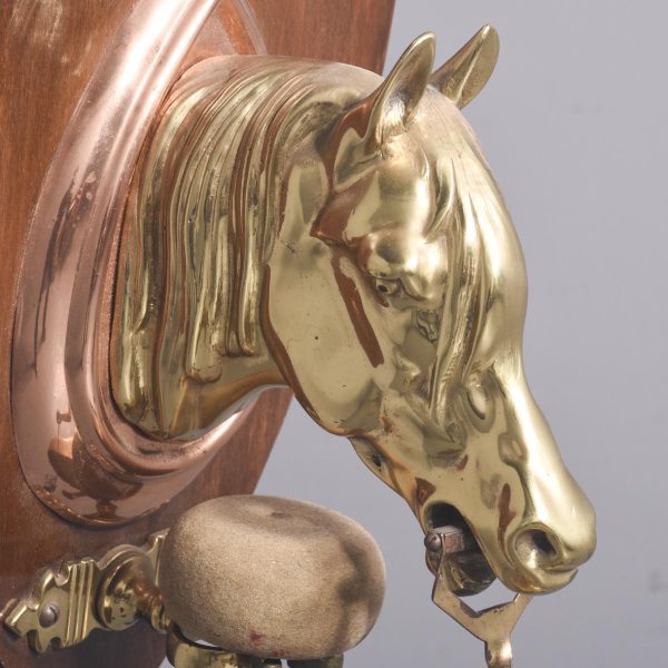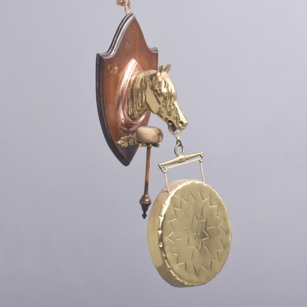 Circa 1900. An unusual stylish equestrian themed wall-mounted gong and beater, mounted on a heraldic shaped shield with a model of a horse’s head in brass with a copper yolk, the bit in the horse’s mouth suspends the circular and beaten brass gong, with a small bracket beneath holding the suede and oak beater.