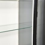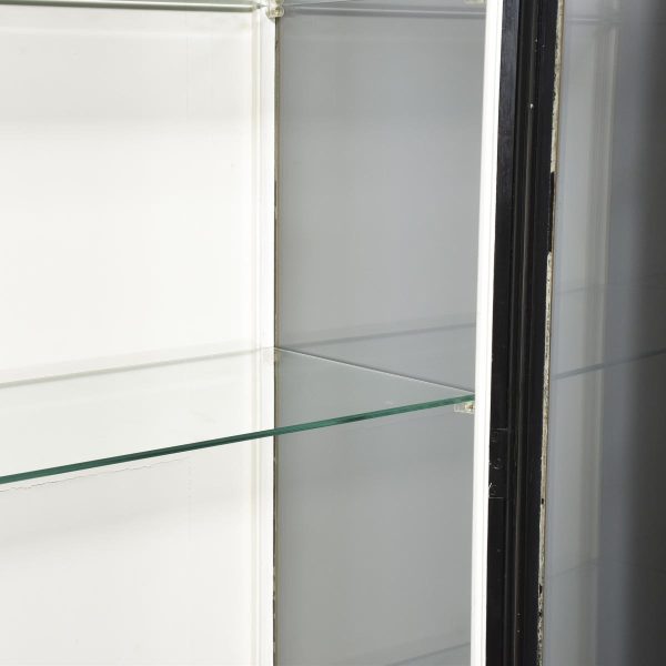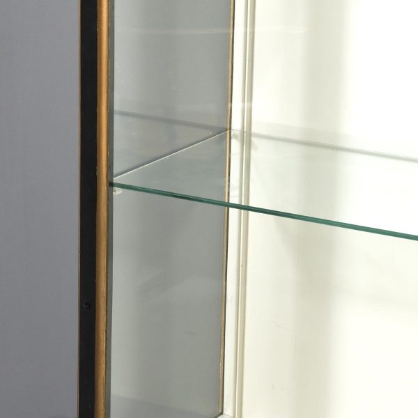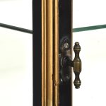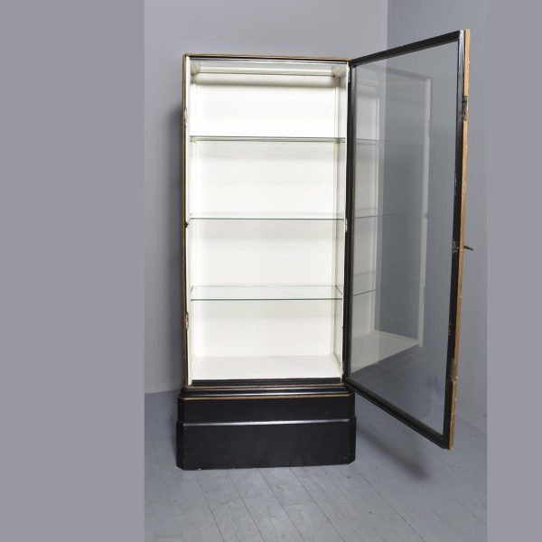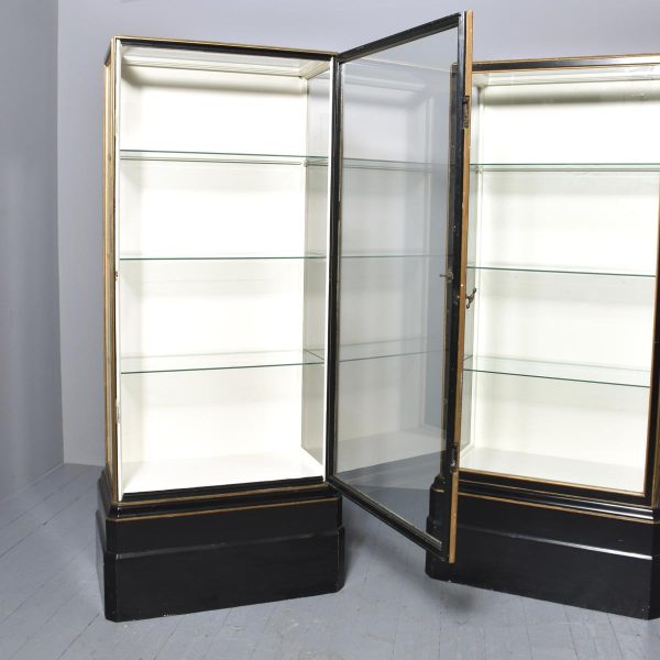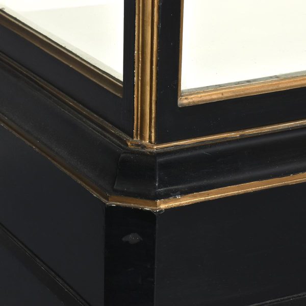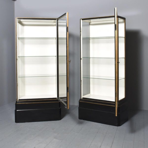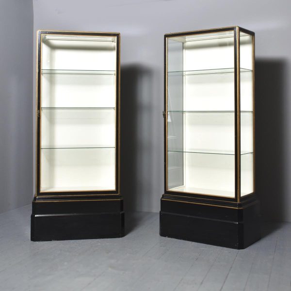 Circa 1900 an exceptional pair of mahogany glazed show cases. The rectangular shaped cases with glazed tops, sides and front. The cases are ebonized and gilded with simple mouldings around the glazed areas, each of the doors has a working lock, and inside the 3 polished plate glass shelves, which are adjustable. Beneath the bottom door there’s an ogee moulding with canted corners, the whole piece standing on an enclosed ebony stepped plinth.