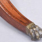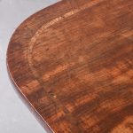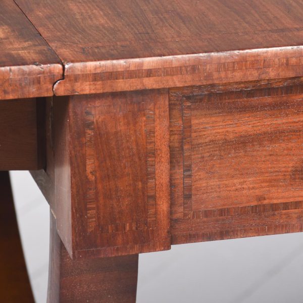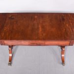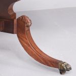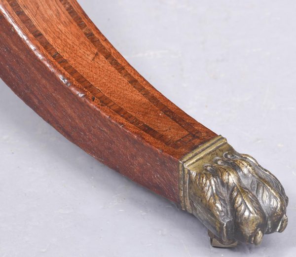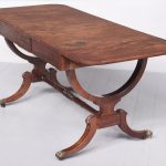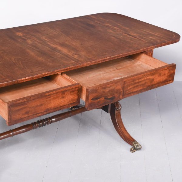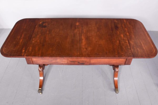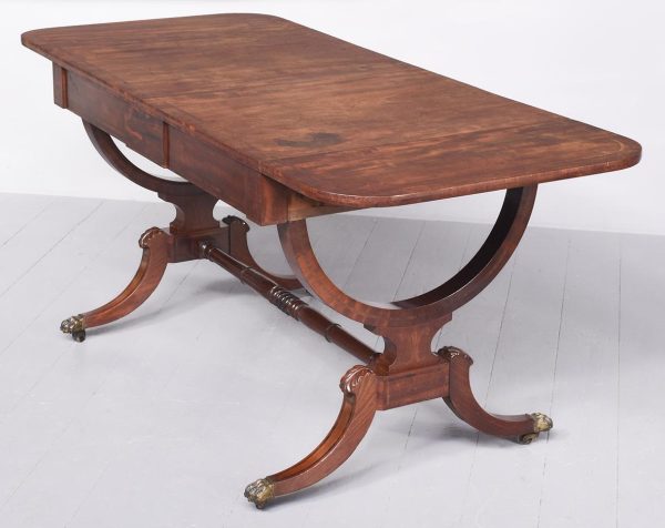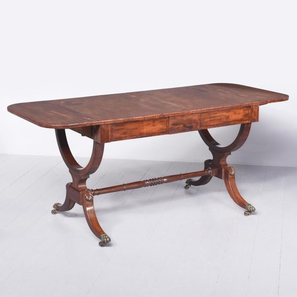 Circa 1810. Exceptional quality figured mahogany George III sofa table. The top in beautifully figured Spanish mahogany with tulip wood inlay with D-end flaps. The two frieze drawers with subtle matching inlay and an unusual drawer-front configuration. Supported on semicircular shaped trestles with an elegant ring turned stretcher above a base with acanthus carved hips and tapering inlaid cabriole feet with original brass lion’s claw caps and castors. Totally original with beautiful colour and patina.