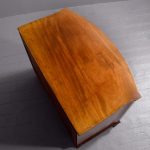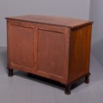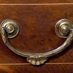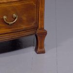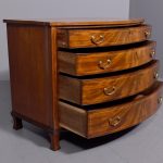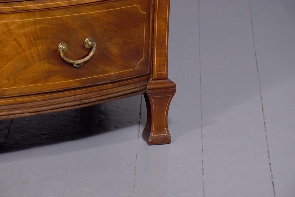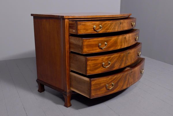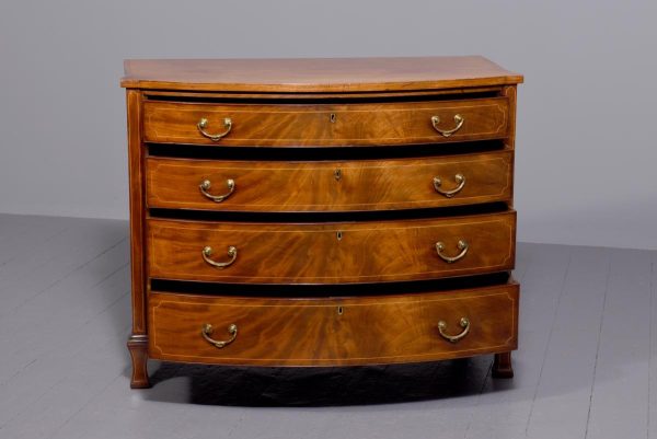 Circa 1820. Exceptional quality inlaid mahogany bow fronted chest, the 4 long graduating drawers with original gold plated swing handles, standing on original shaped supports. Beautiful mellow colour.