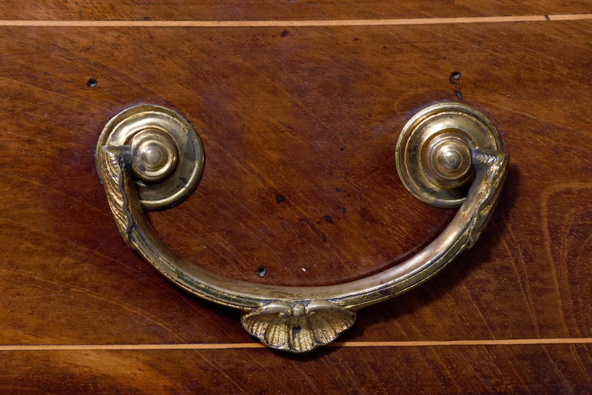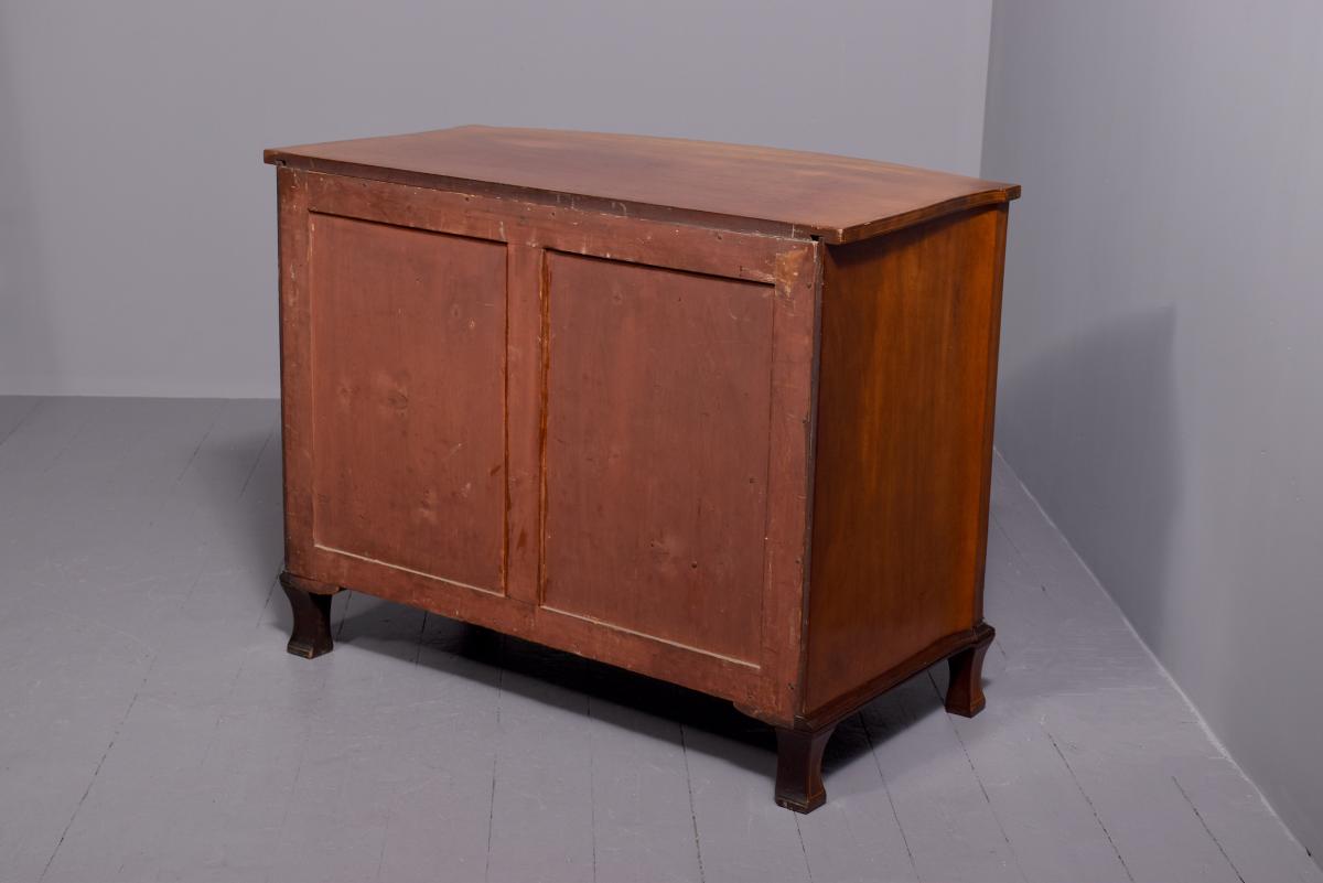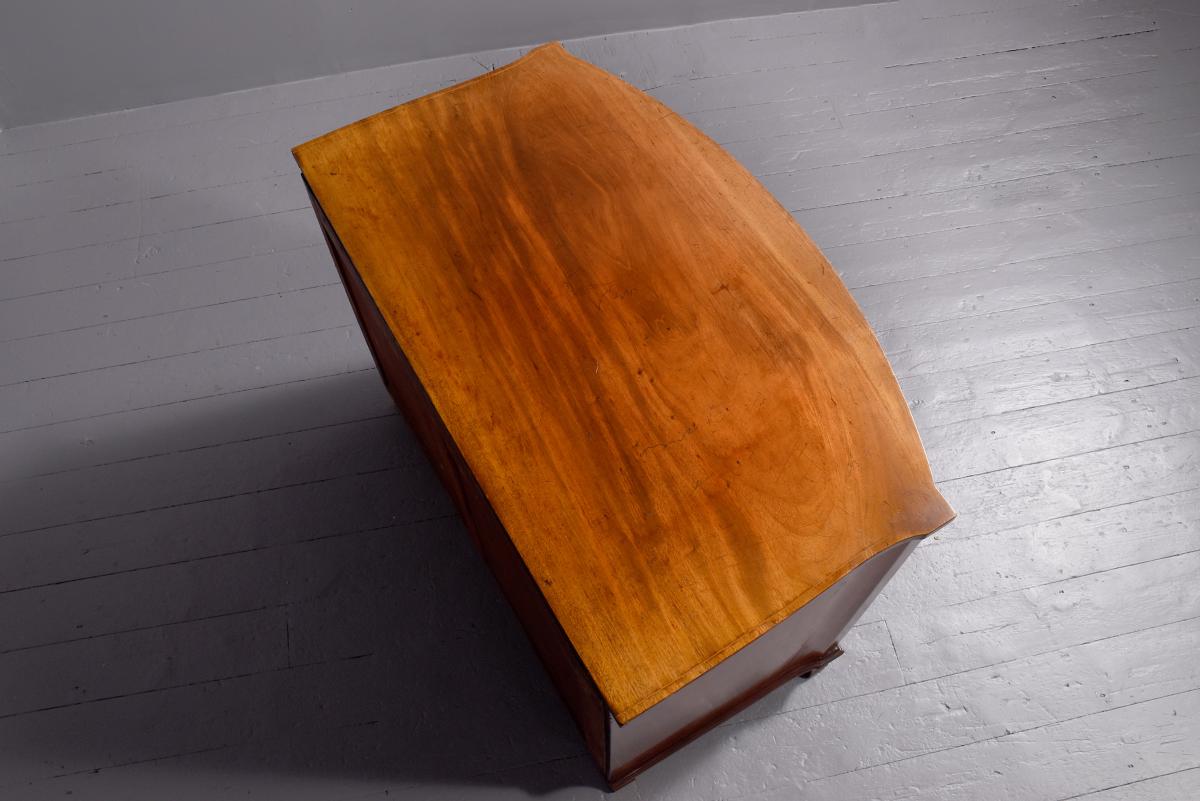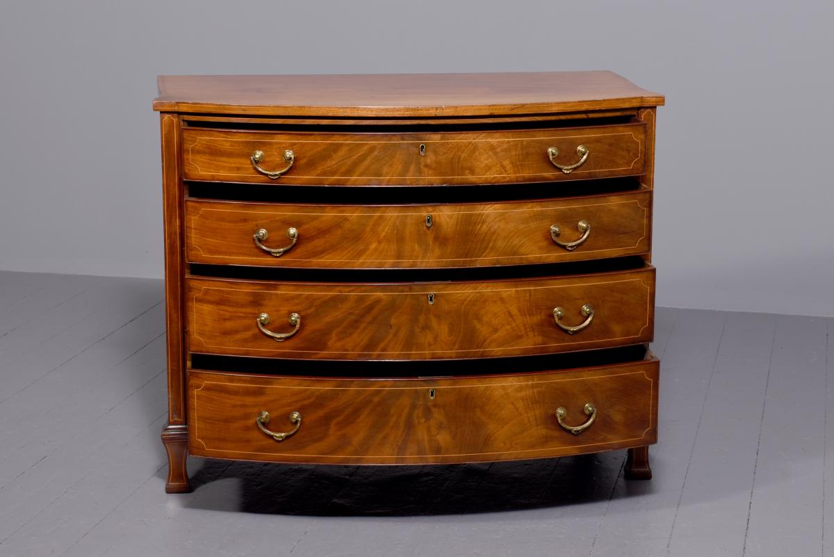 Circa 1820. Exceptional quality inlaid mahogany bow fronted chest, the 4 long graduating drawers with original gold plated swing handles, standing on original shaped supports. Beautiful mellow colour.
