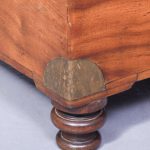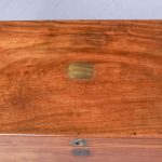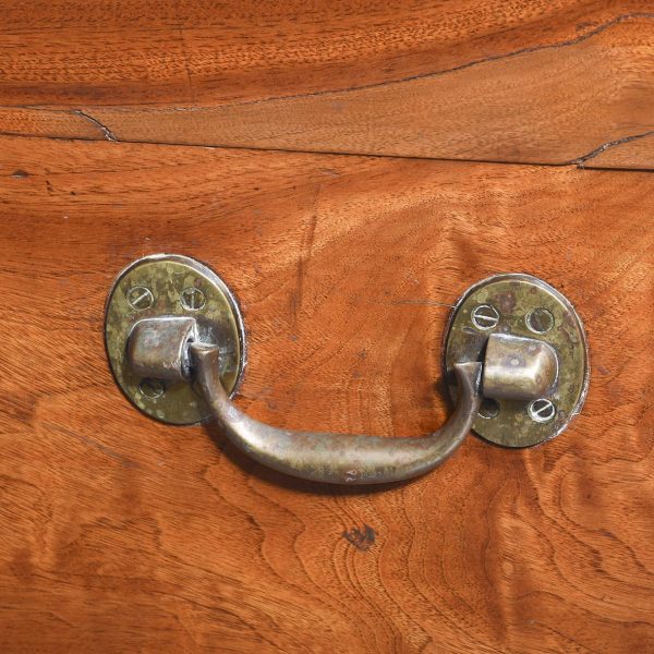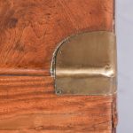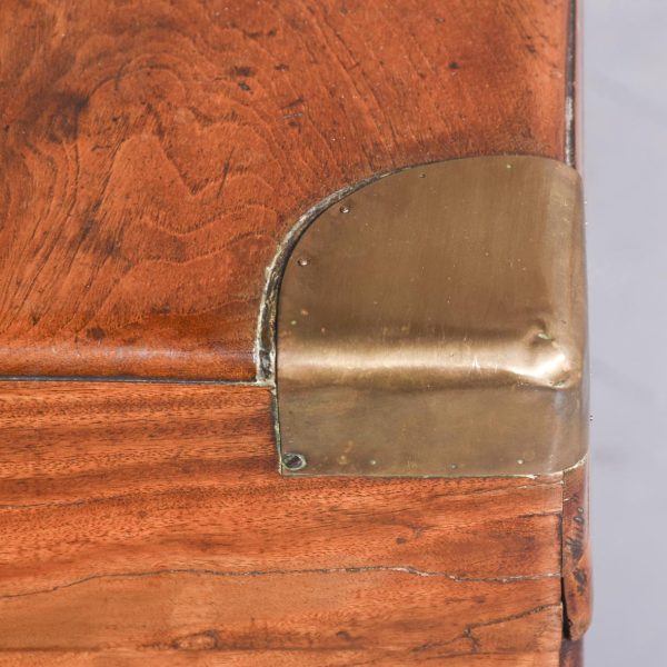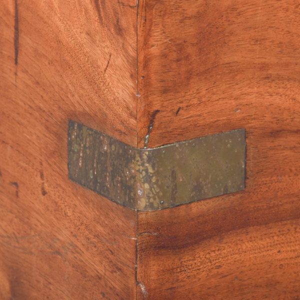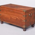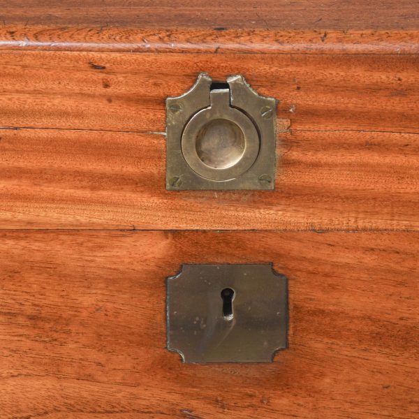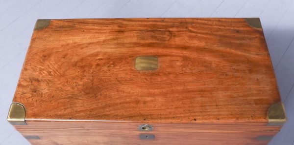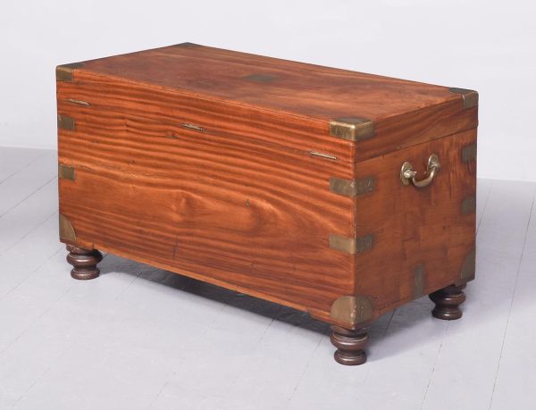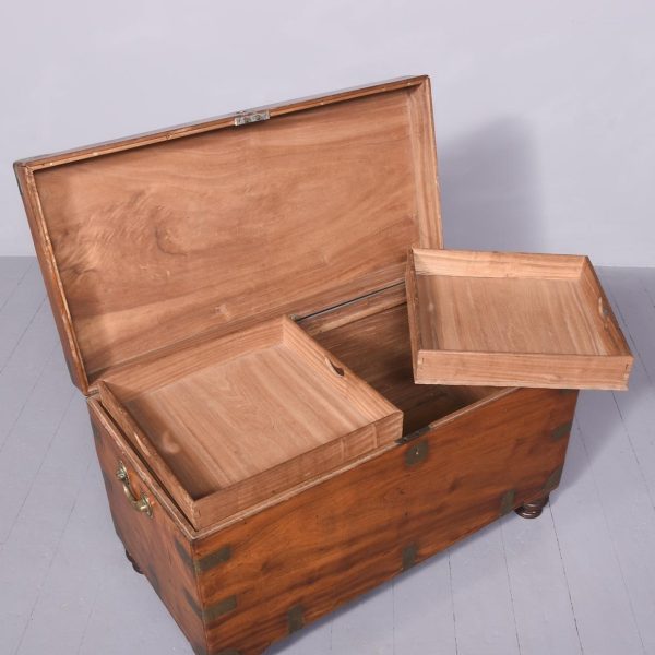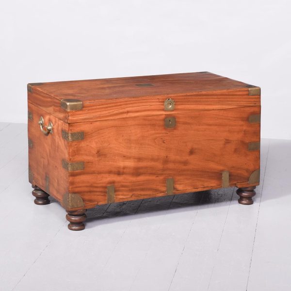 Circa 1860 Exceptional Victorian brass-bound solid camphorwood trunk. The rectangular top with brass overed rounded corners, brass strapping and a center brass plaque with inset military type handle, brass escutcheons and extensive brass strapping. Heavy cast-brass original carrying handles supported on neat turned feet. In lovely condition.