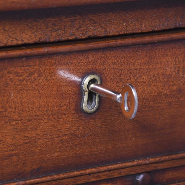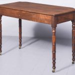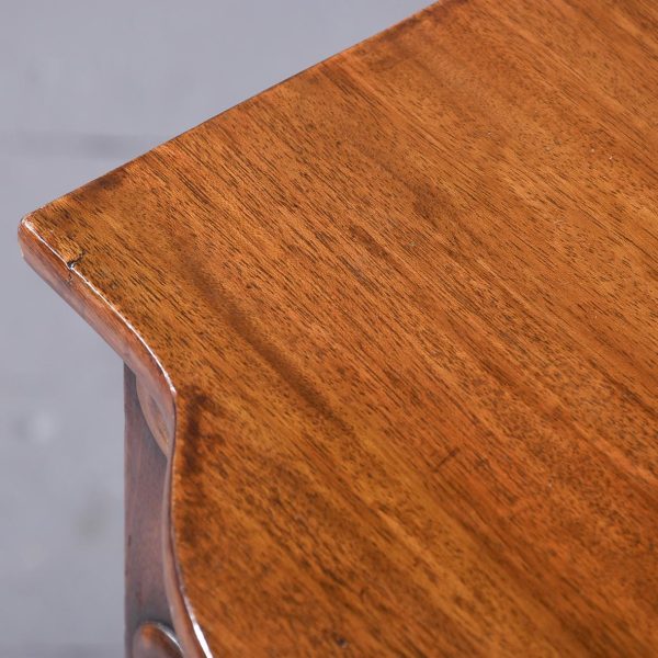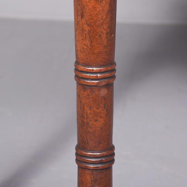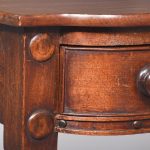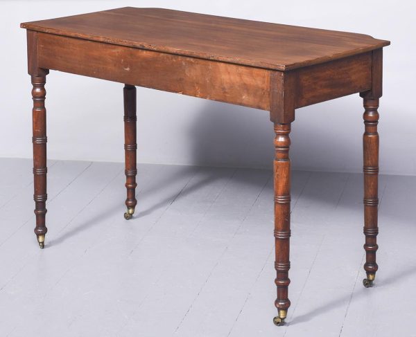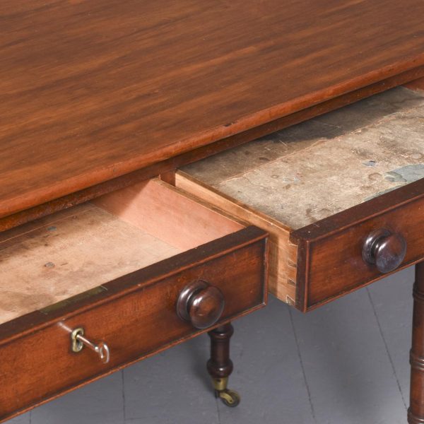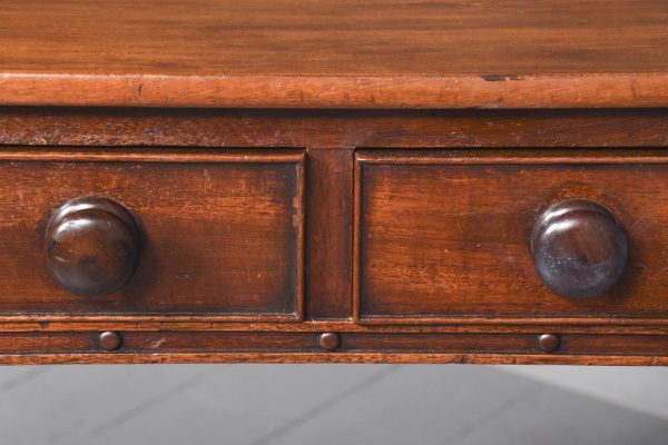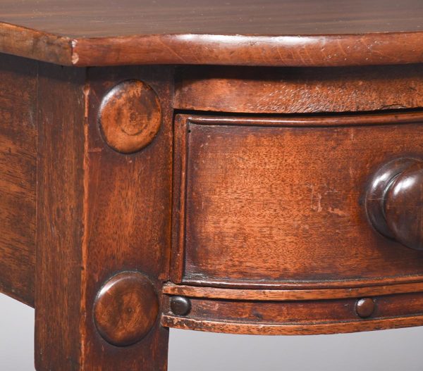 Circa 1830 Exceptionally Scottish (possibly Edinburgh) William 4th mahogany 2 drawer table. The shaped front top in a single piece of figured Spanish mahogany with lovely colour and patina above 2 shaped cockbeaded frieze drawers with original rosewood knobs and an unusual frieze with roundels. The ring-turned legs with roundel capitals, finishing on original brass caps and castors, lovely colour and condition.