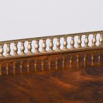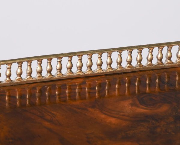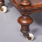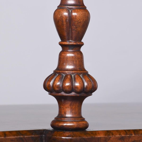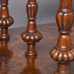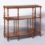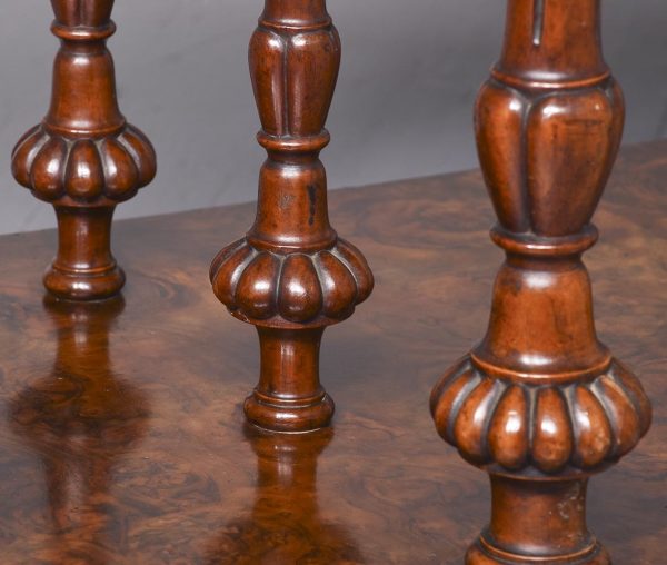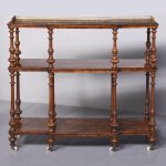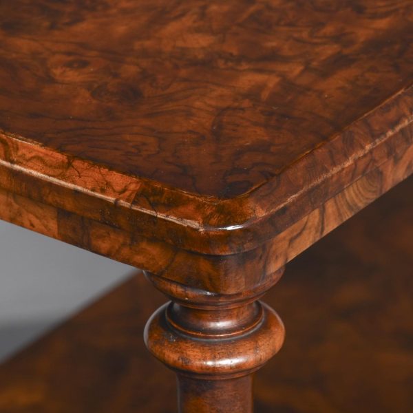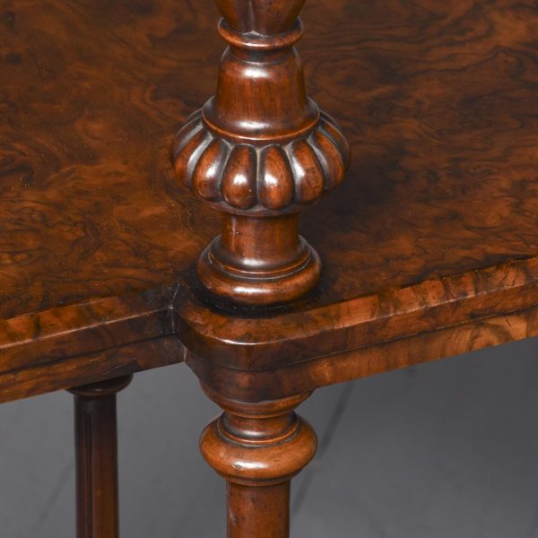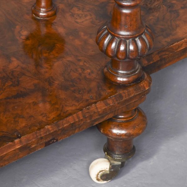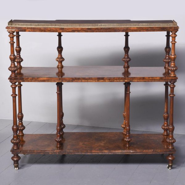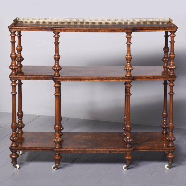 Circa 1860. A mid Victorian exhibition quality burr walnut three tier what-not. The shaped top in the finest burr walnut with a pierced three-quarter brass gallery, with chamfered fore-edge and frieze. The tiers are all supported on ring turned carved uprights, varying in style and shape, each of the tiers are finished in the finest burr walnut and follow the form of the top, all resting on six bulbous legs with gilded brass rings, and the original white porcelain patented castors.