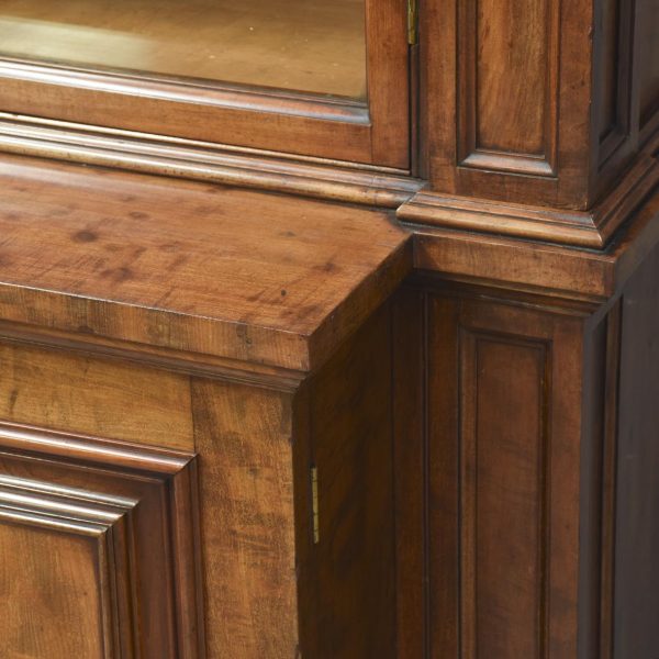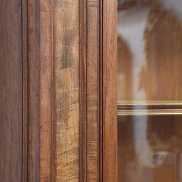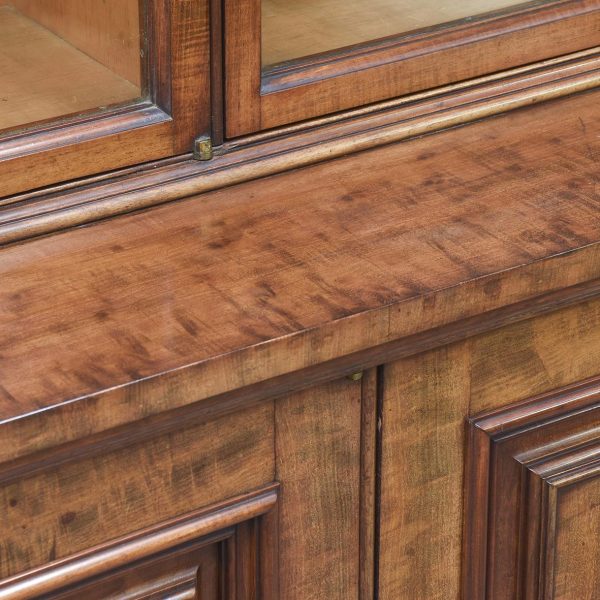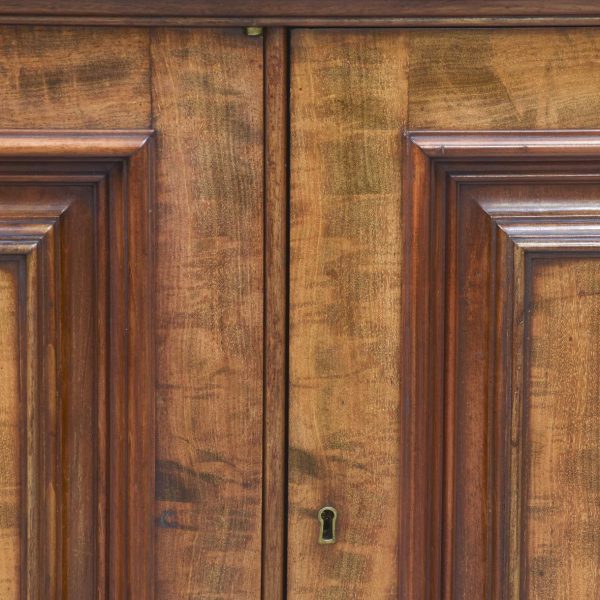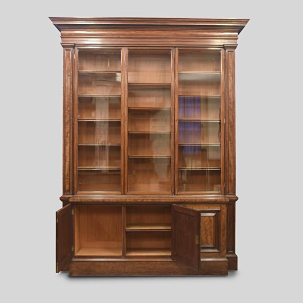 Circa 1825. An excellent George IV mahogany 3 door cabinet bookcase. The moulded stepped cornice with ogee and convex c mouldings, above three full length doors flanked by a pair of elegant paneled pilasters. Each of the sections with adjustable shelves with polished facings, the doors with original patent action locks, working perfectly. The flat section in plum pudding mahogany and the base with three raised paneled doors with fine beadings, flanked by a smaller pilaster similar to the top, all resting on an enclosed shaped plinth which follows the form of the bookcase, with a cut out section at the back to accommodate a skirting board.