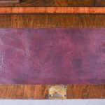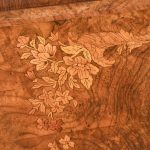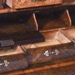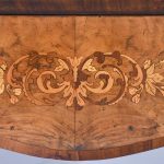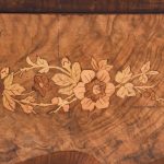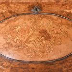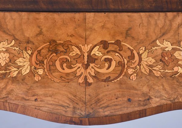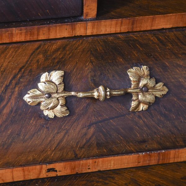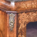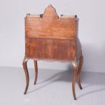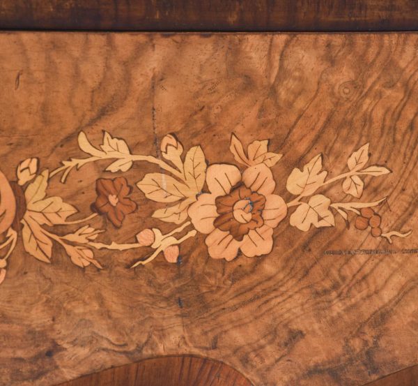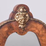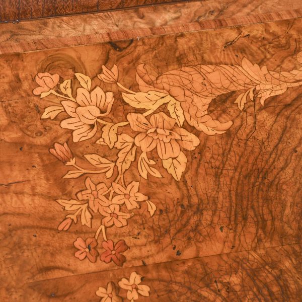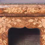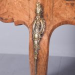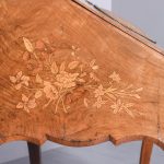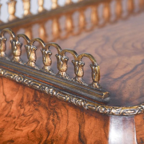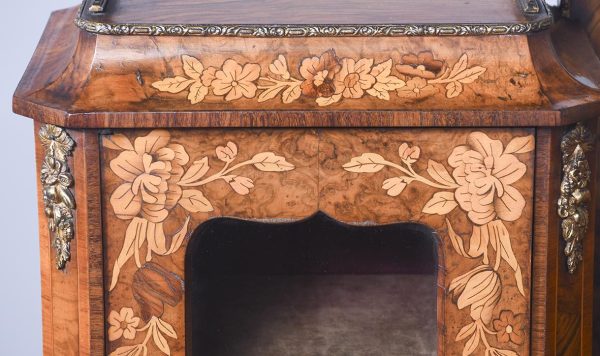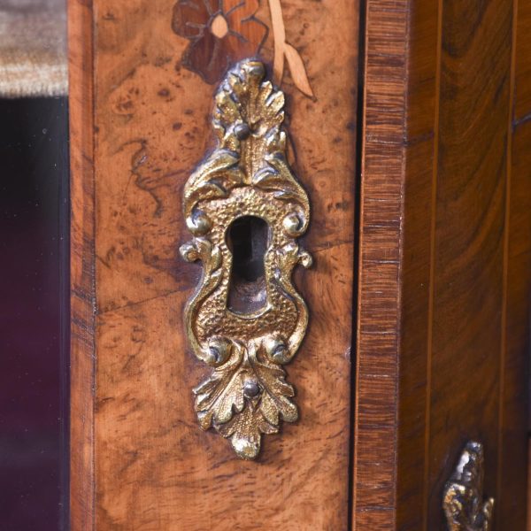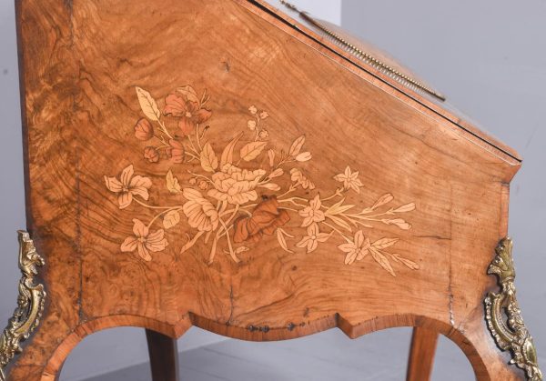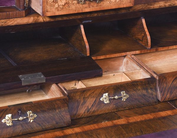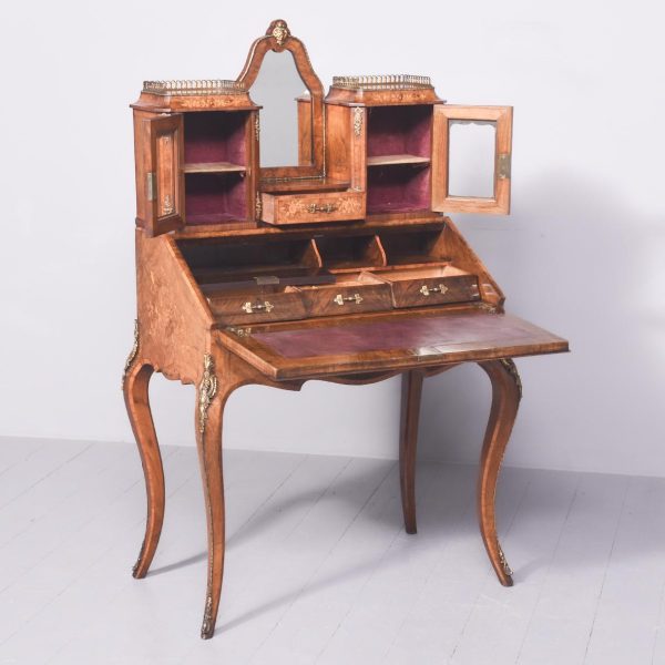 Circa 1870. An exhibition quality mid Victorian burr walnut, rosewood and marquetry Bonheur de jour. The sup structure with a central mirror flanked by a pair of glazed cupboards with a ¾ pierced brass gallery above the slope. The domed slope with marquetry opens to a well fitted interior of pigeon holes, drawers and a secret well, above a stylish shaped frieze, raised on four elegant cabriole legs with gilt metal throughout finishing on quality cast sabots.
