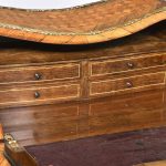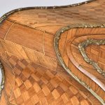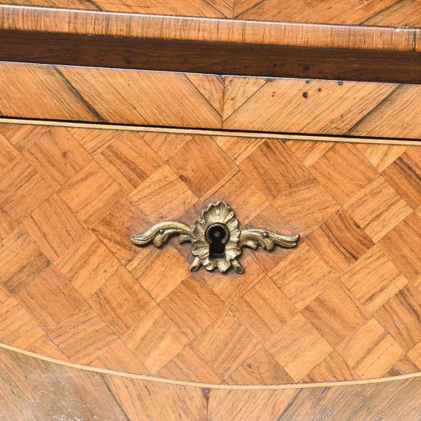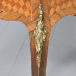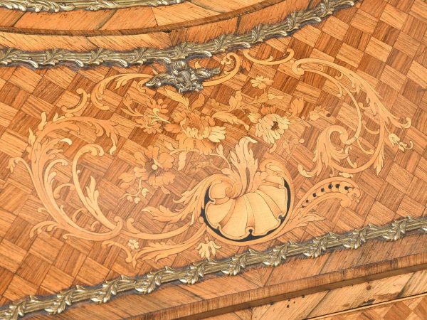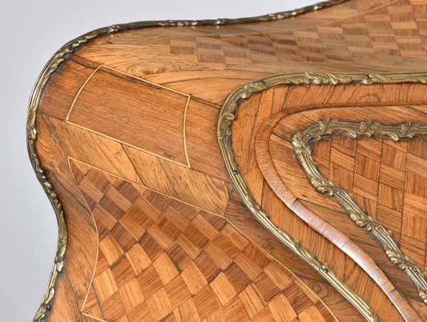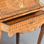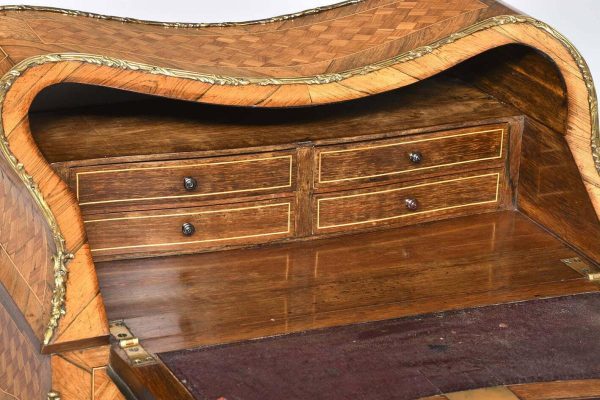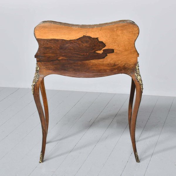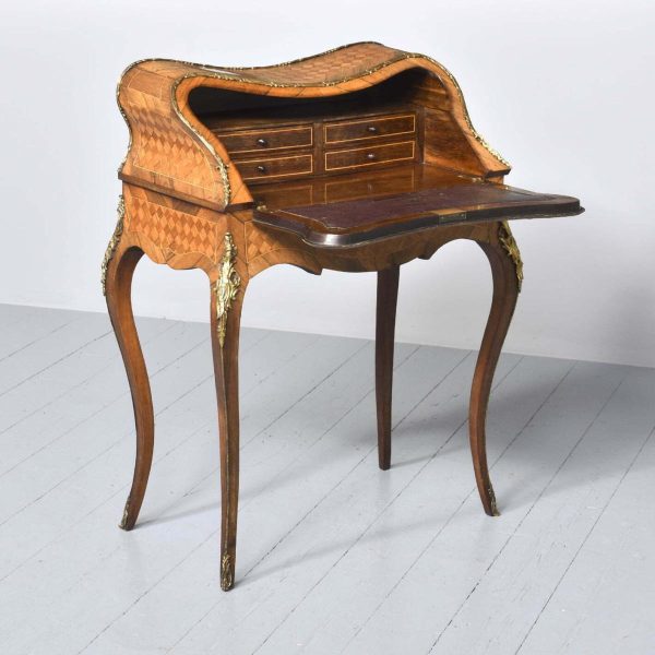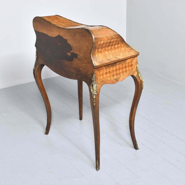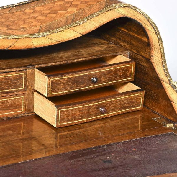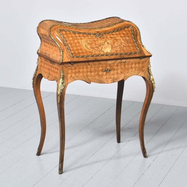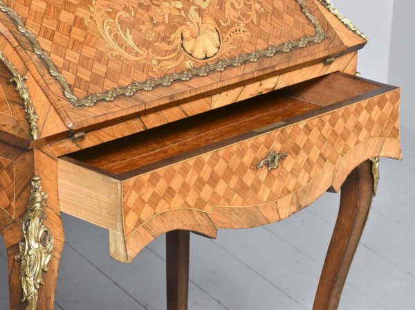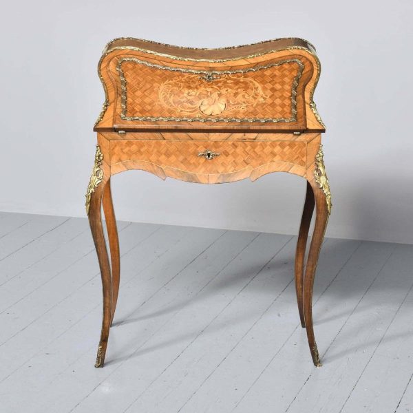 Circa 1870. Exhibition-quality marquetry-inlaid French, kingwood bureau de dame. The shaped top with marquetry inlaid kingwood panels surrounded by boxwood inlay and cross banded rosewood. The whole bureau with extensive beautifully cast ormolu mounts. the marquetry inlaid bureau flap opening to embossed writing leather slope and fitted interior. All above a shaped frieze drawer mahogany liners and ormolu escutcheon and key. With marquetry inlaid sides and supported on tapering cabriole legs with beautiful ormolu mounts and finishing in sabots. (brass label in the drawer Druce & Co, Bakery Street, Portland Square London). Likely were retailers of this French Bureau.