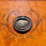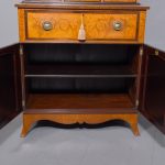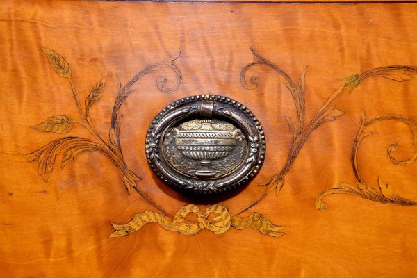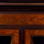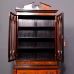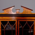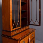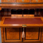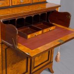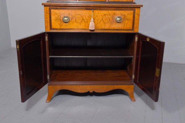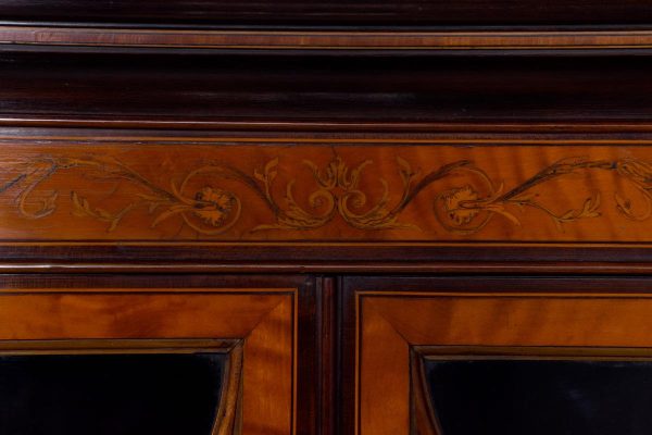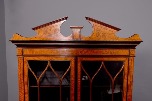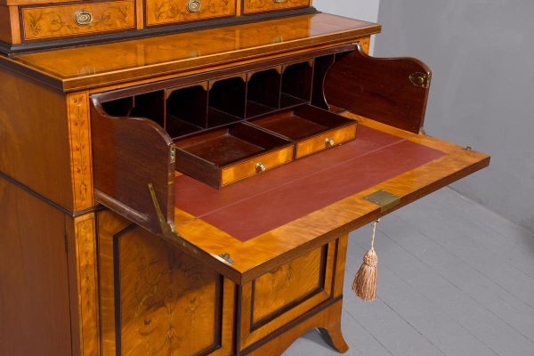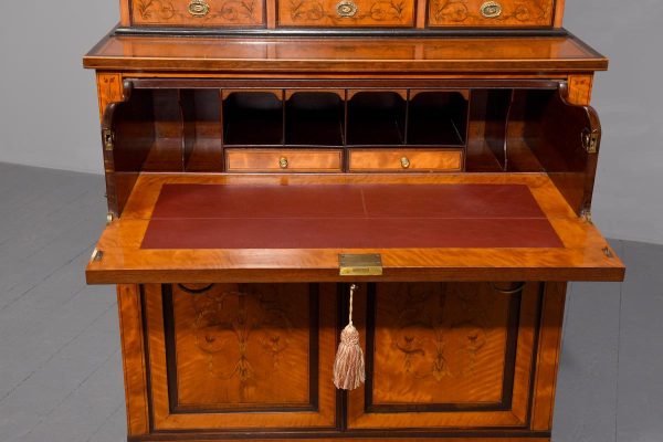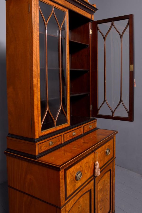 Circa 1880.Exhibition quality marquetry inlaid satinwood secretaire bookcase. Surmounted by an astragal glazed shelved bookcase with a neoclassical foliate inlaid frieze and a “broken cornice”. The base with three frieze drawers with ormolu (gold covered) brass handles, solid mahogany liners and foliate inlay. The top with foliate inlay in exotic woods. Beneath is the profusely inlaid secretaire drawer with oval ormolu handles opening to a fitted interior with drawers and pigeonholes, leather writing surface, all in perfect condition. Beneath are two marquetry doors with cornucopia and foliate inlay, opening to shelved bookcase. All supported on a base with French bracket feet and a shaped skirt.
