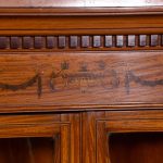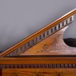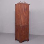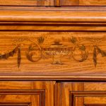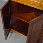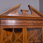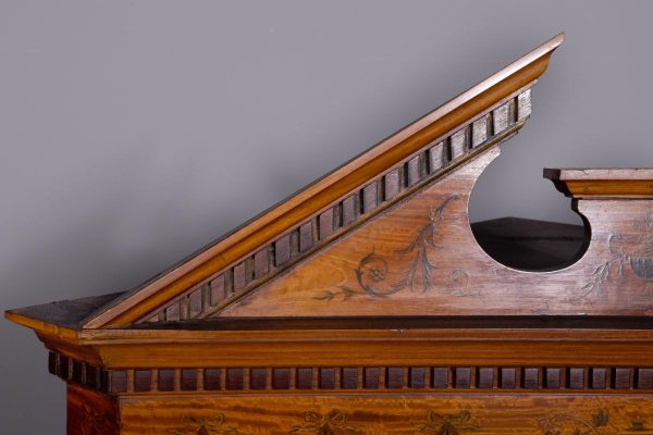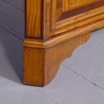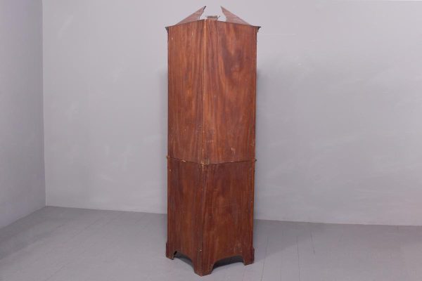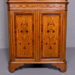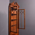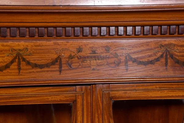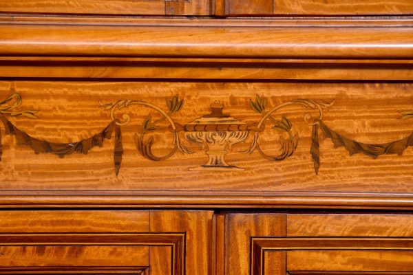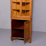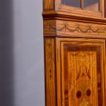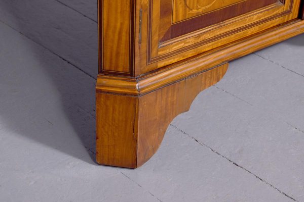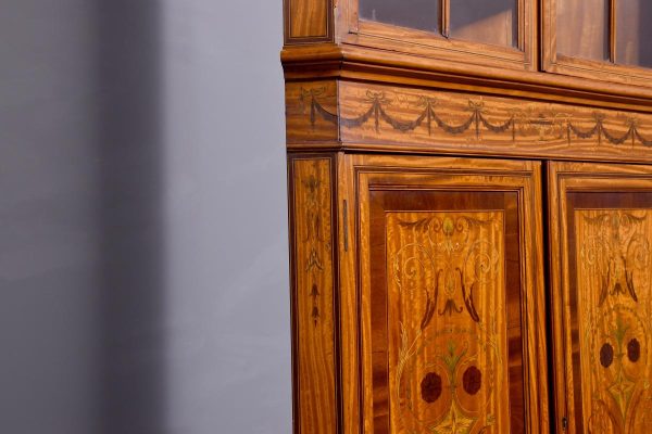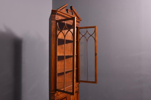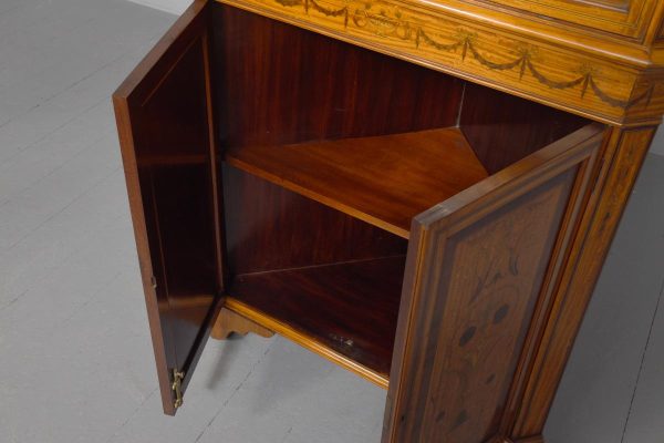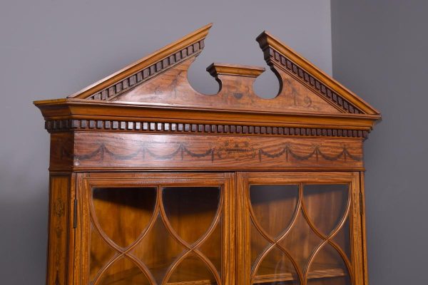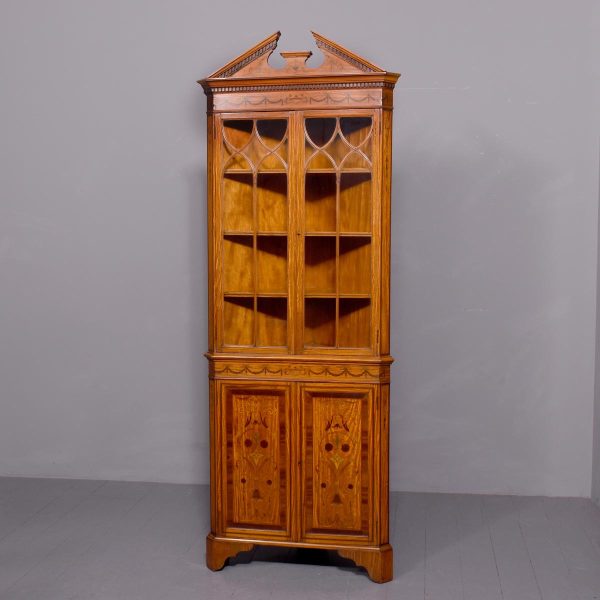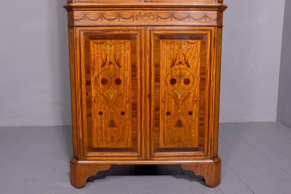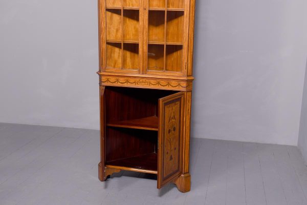 Circa 1880. Exhibition quality marquetry inlaid tall satinwood corner cupboard surmounted by a broken cornice with detailed foliate inlay in exotic woods and Greek key decoration. With two astragal-glazed inlaid doors with shaped glazing bars and inlay opening to shelved interior. The base with marquetry inlay doors and deeper shelving, all on bracket feet.