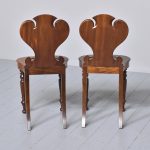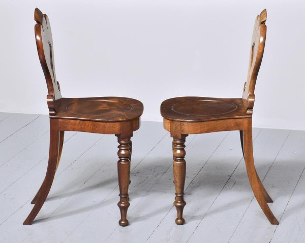 Circa 1830, an exhibition quality pair of mahogany William IV Hall chairs, with the solid heart shaped back, with flamed mahogany insert, solid seat with carved recessed circular center, and rounded foredge. Beneath there’s is a shaped frieze which follows the form of the seat, the back legs are square and slightly outswept, the front legs are turned, ring turned, tapering legs which finish on a bulbous toe. The chairs have excellent colour and patination.