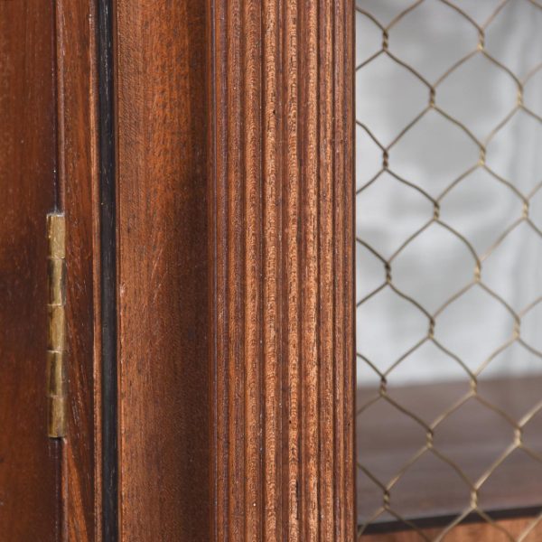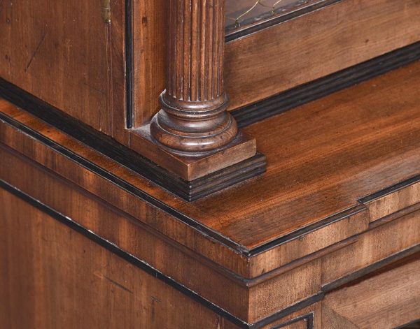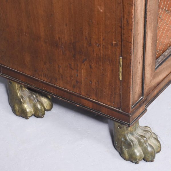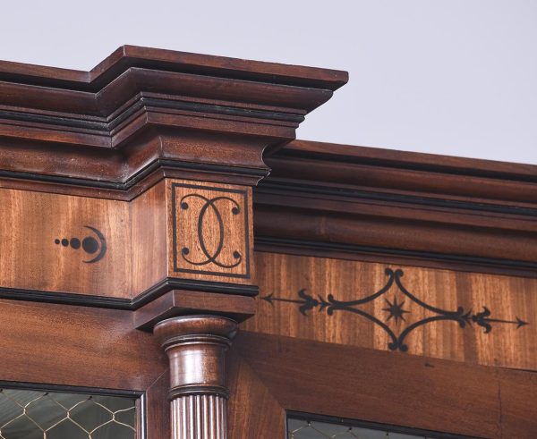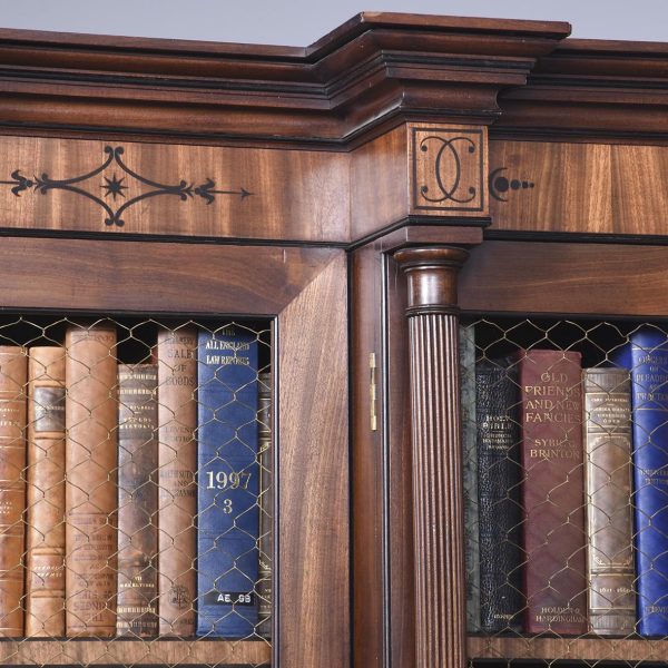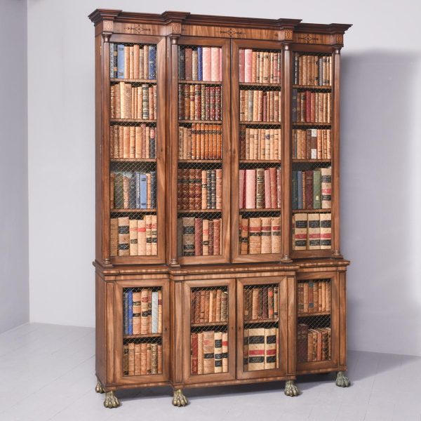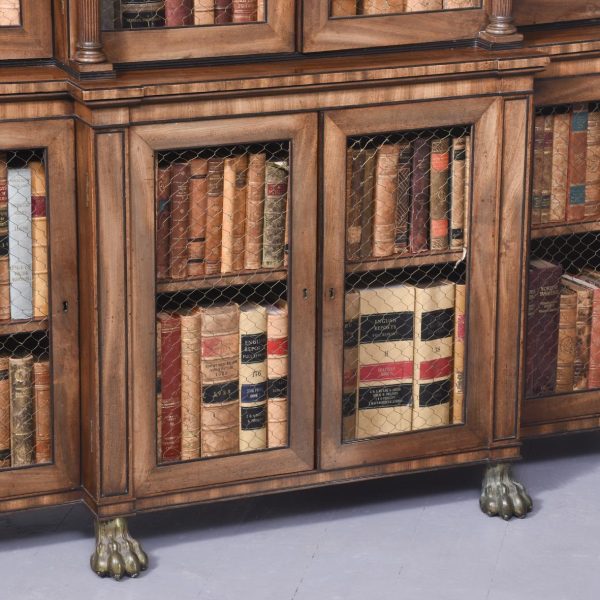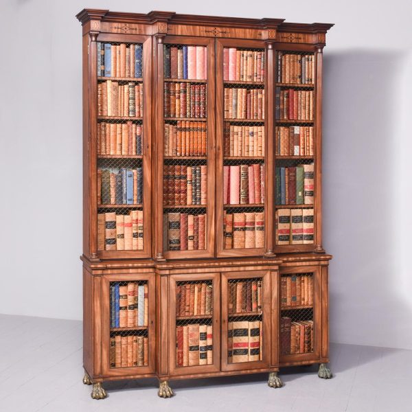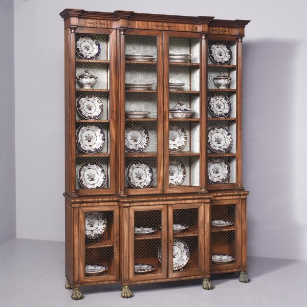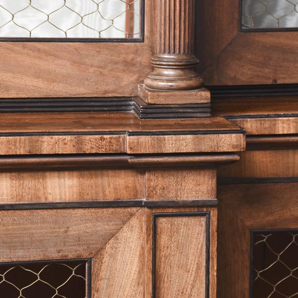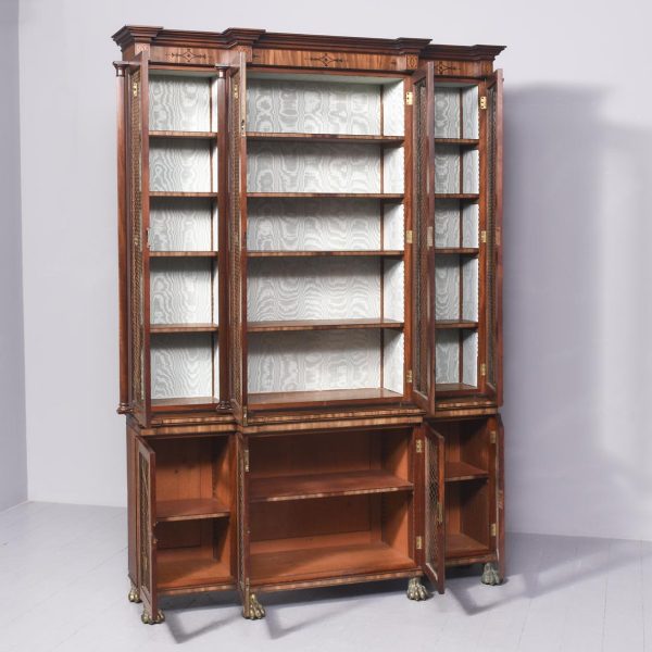 Circa 1815. An exhibition quality Regency mahogany 4 door breakfront cabinet bookcase, the elegant moulded cornice with stylish ebony inlay panels in the frieze, below with four full length doors with brass mesh with four crisp, elegant fluted columns attached to the door frames, inside each section there are four adjustable shelves, the sides and back are lined in water-silk , the base section with four shorter doors with flat framed pilasters to the sides, fore-edges of the doors, frames and carcass are finished in polished ebony, beneath the bottom doors there is elegant beading and the bookcase rests on six substantial original bronze animal feet.