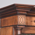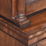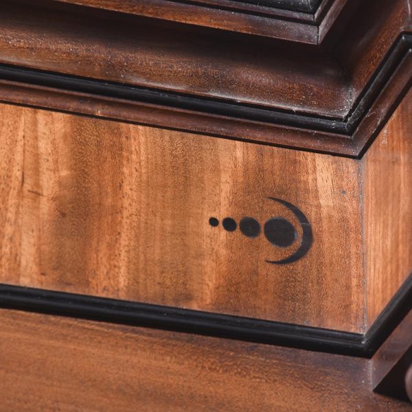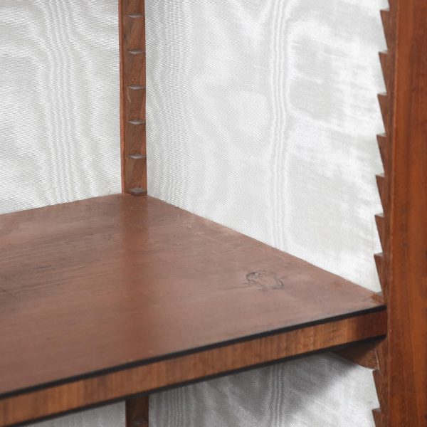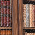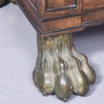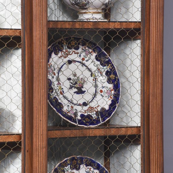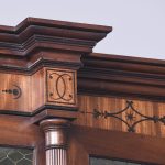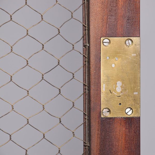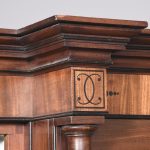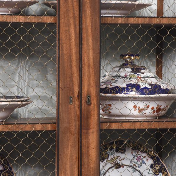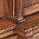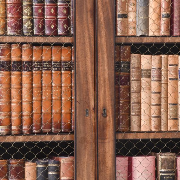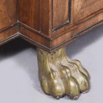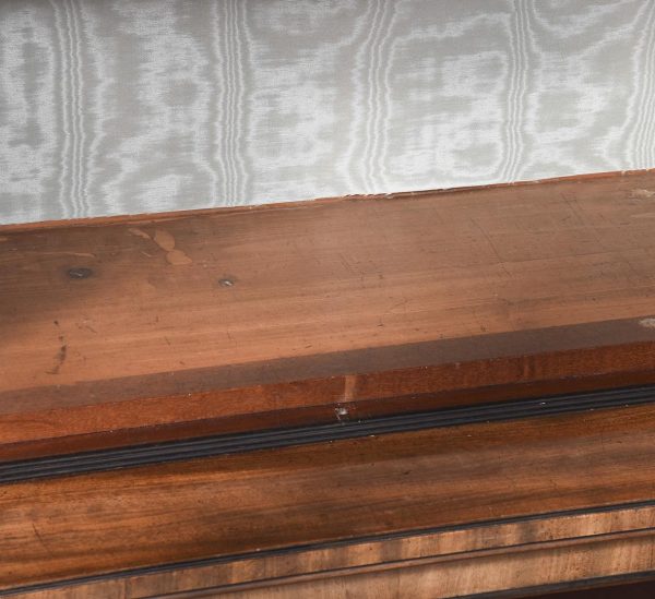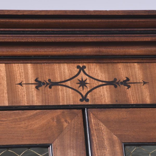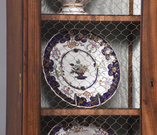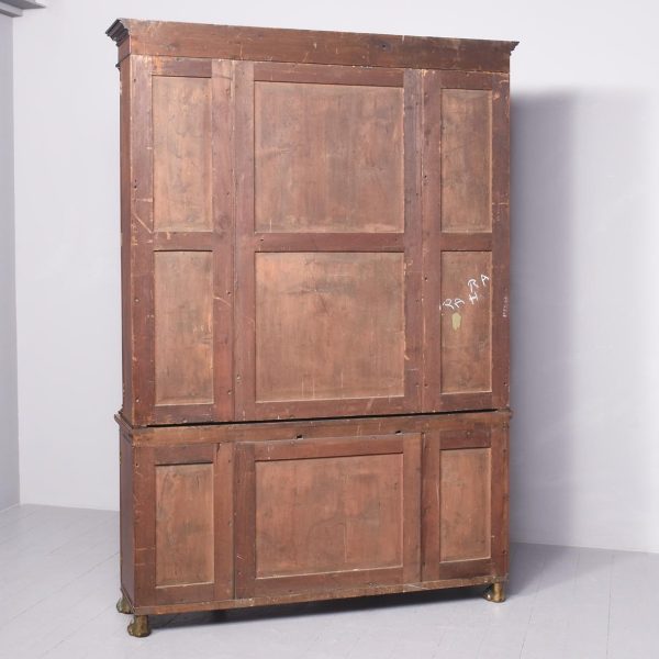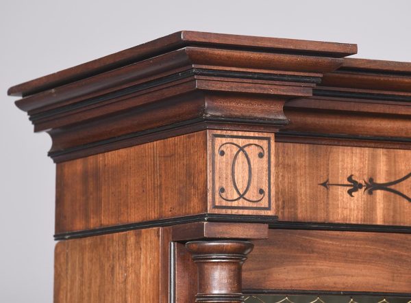 Circa 1815. An exhibition quality Regency mahogany 4 door breakfront cabinet bookcase, the elegant moulded cornice with stylish ebony inlay panels in the frieze, below with four full length doors with brass mesh with four crisp, elegant fluted columns attached to the door frames, inside each section there are four adjustable shelves, the sides and back are lined in water-silk , the base section with four shorter doors with flat framed pilasters to the sides, fore-edges of the doors, frames and carcass are finished in polished ebony, beneath the bottom doors there is elegant beading and the bookcase rests on six substantial original bronze animal feet.