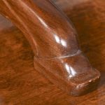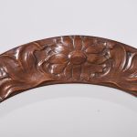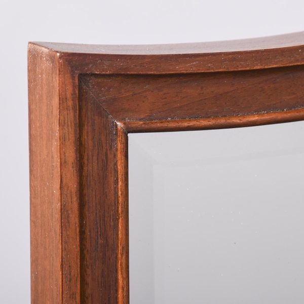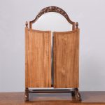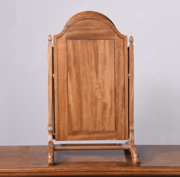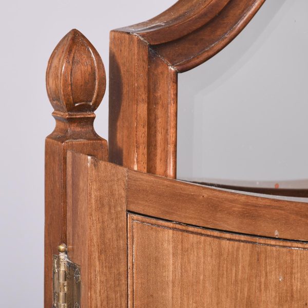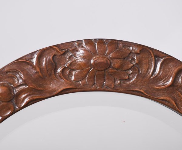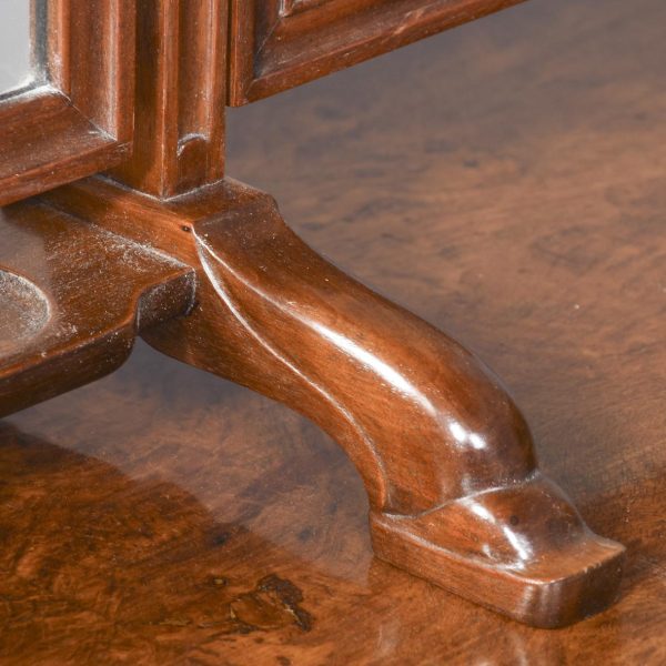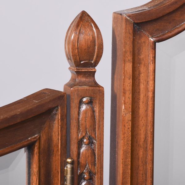 Circa 1900. Carved Mahogany Triptych mirror by’ Whytock & Reid of Edinburgh’ after a design by’ Sir Robert Lorimer’. The three shaped mirrors contained within a stylish mahogany frame with beveled edging, the central mirror with a raised and carved crest, all supported on stylish uprights surmounted by elegant finials with carved harebells beneath, with a small trinket tray bracing the two uprights, resting on carved trestle feet, the backs of the mirrors are polished and panelled.