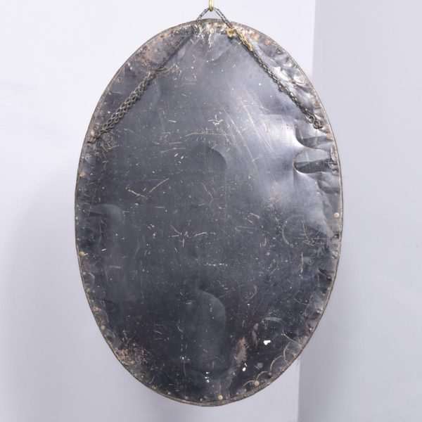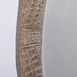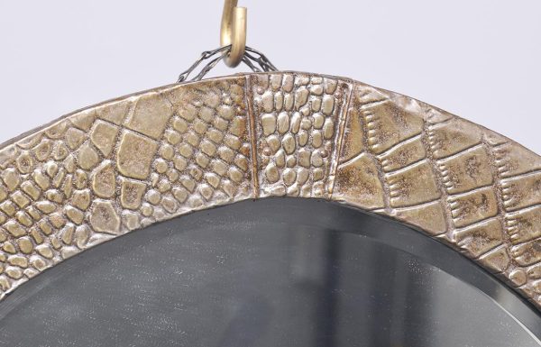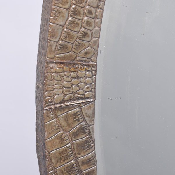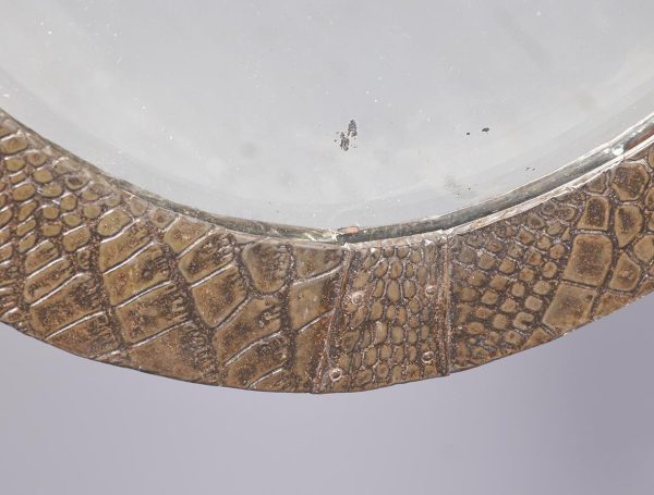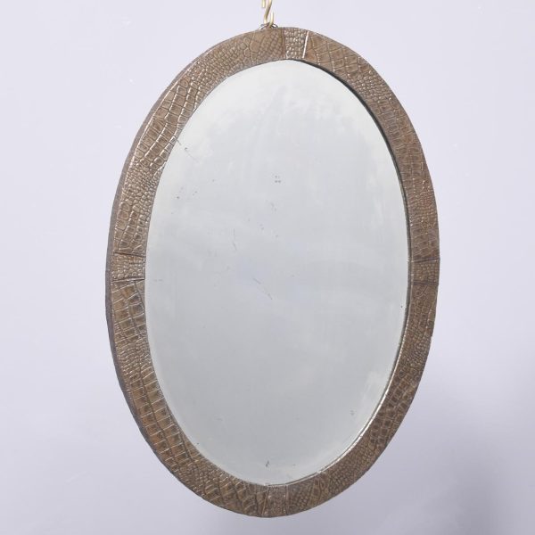 Circa 1930s. An interesting oval shaped bevel edge mirror contained in a metal frame which has been plamished and looks like faux snakes skin. The mirror with some scratches and foxing with the frame folded over to the bevel edge glass, onto the facing and around the sides. Can be hung either landscape or portrait.