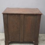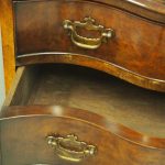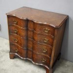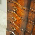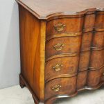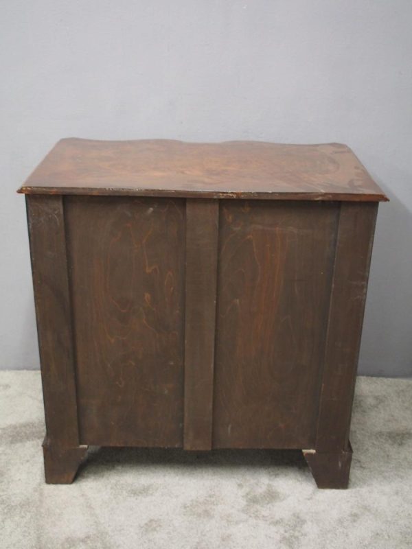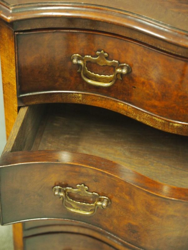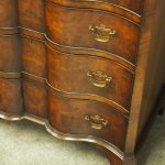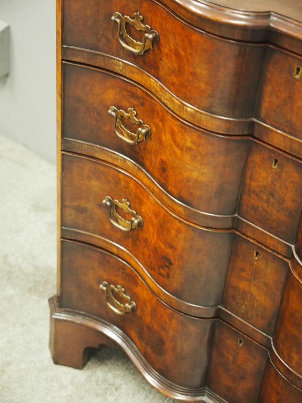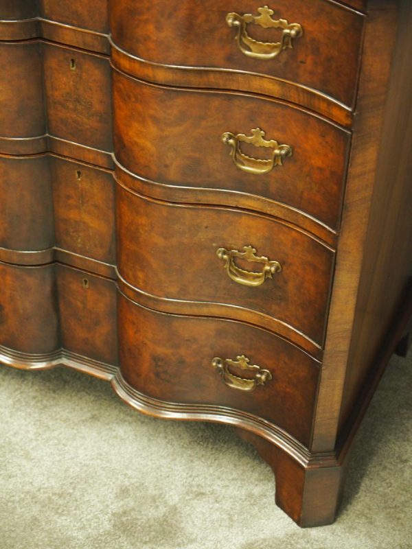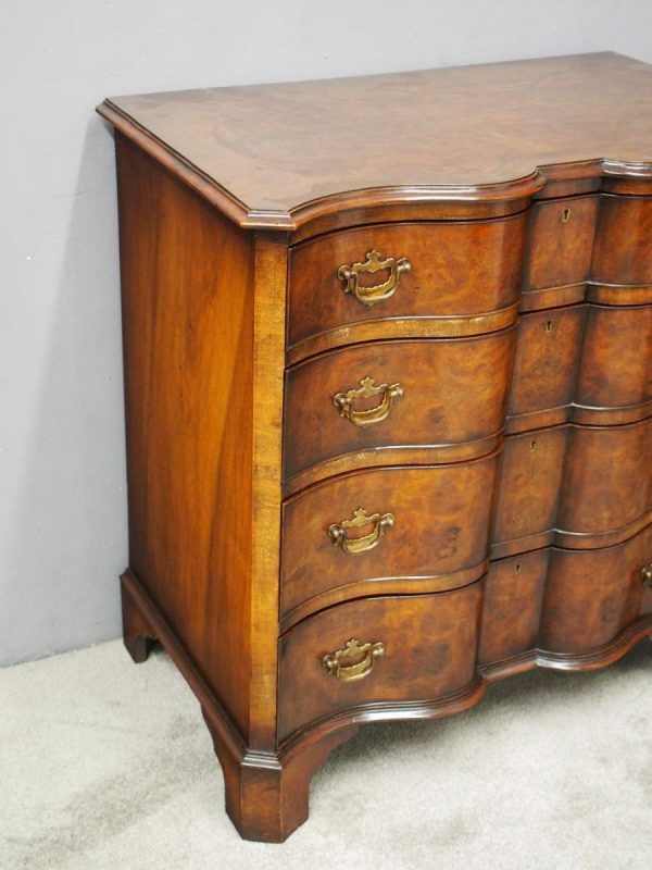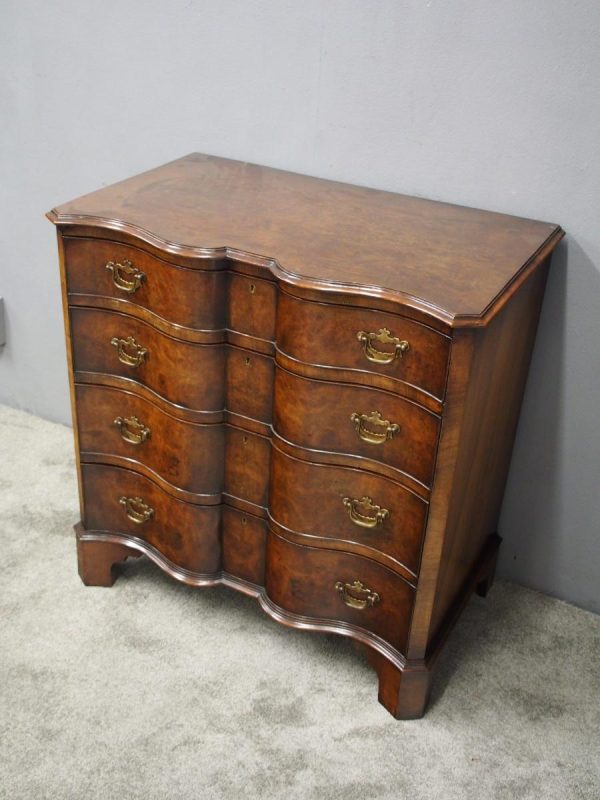 Circa 1900, figured walnut, block-front chest of drawers. The serpentine top in mirror matched figured veneers and with moulded edges over 4 long graduated drawers with cast brass handles and raised on bracket feet.