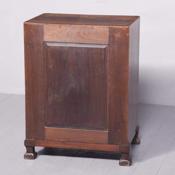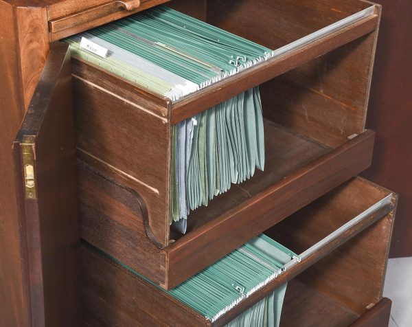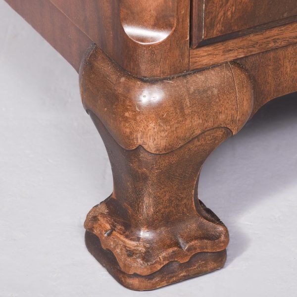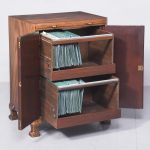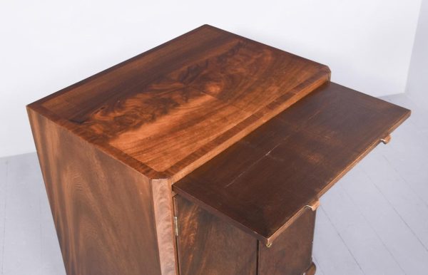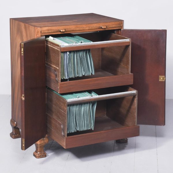 Circa 1920. A mahogany 2 door cabinet/filing cabinet by ‘Whytock & Reid of Edinburgh’, the rectangular top with a canted corner book matched flame mahogany with cross banding, beneath the top is a pull out slide and a pair of full length doors with classic ‘Whytock & Reid’ cast brass drop handles the inside is fitted out with 2 layers of hanging file racks which may be removed, beneath the doors there’s a shaped frieze and the cabinet rests on 4 classic shaped ‘Whytock & Reid’ feet