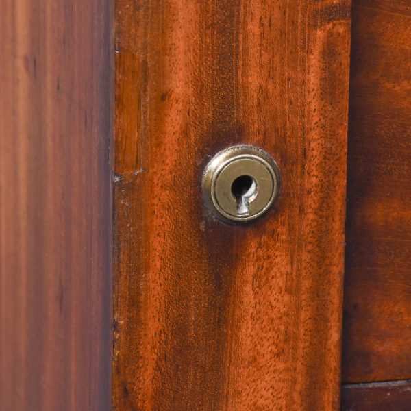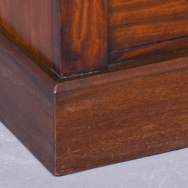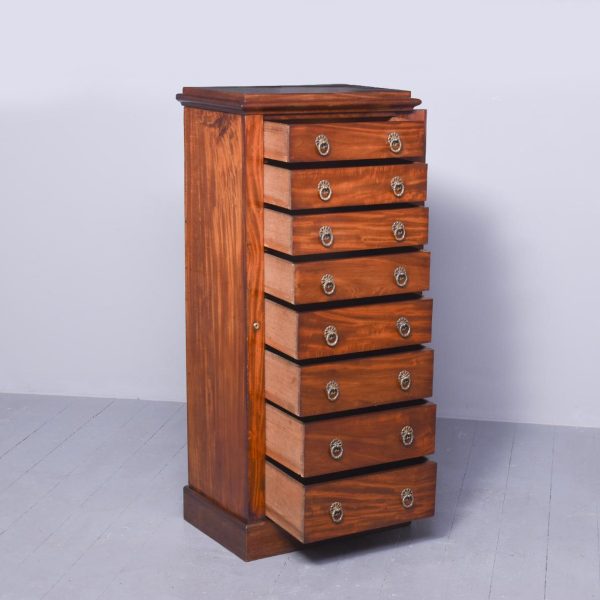 Circa 1840. Fine quality William IV mahogany Wellington chest. The polished top above a cavetto moulded frieze and 8 graduated drawers with flame mahogany fronts and cast brass ring handles with locking pilaster to the side with Bramah lock with working key, all over a chamfered plinth base. In perfect original condition with a lovely colour and patina.