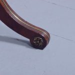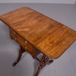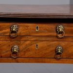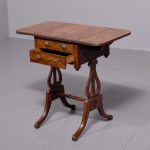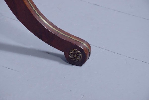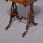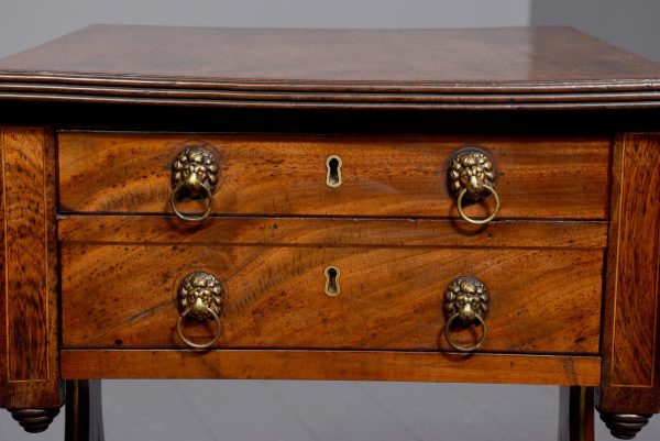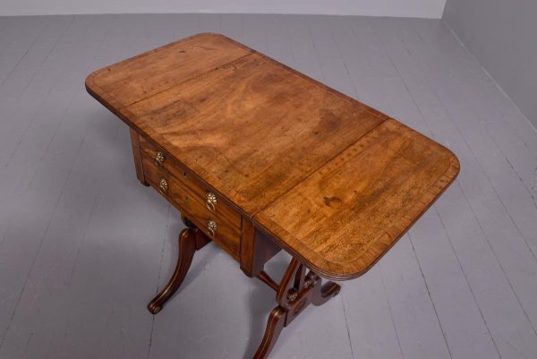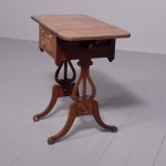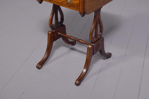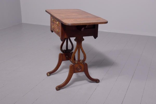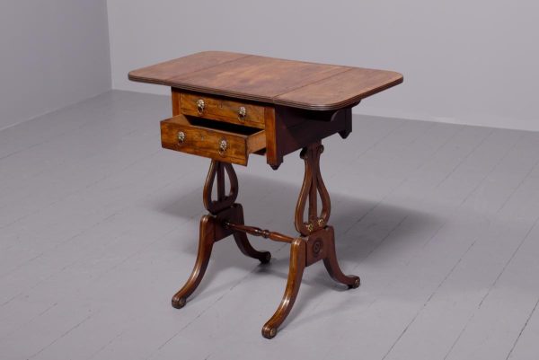 Circa 1810. Fine Regency brass inlaid mahogany work/side table on lyre supports. The rectangular drop-flap top with reeded edges above single drawers on each side, above faux drawers and supported on beautiful lyre supports with brass inlay and brass rosettes, with a turned stretcher over brass inlaid cabriole legs.