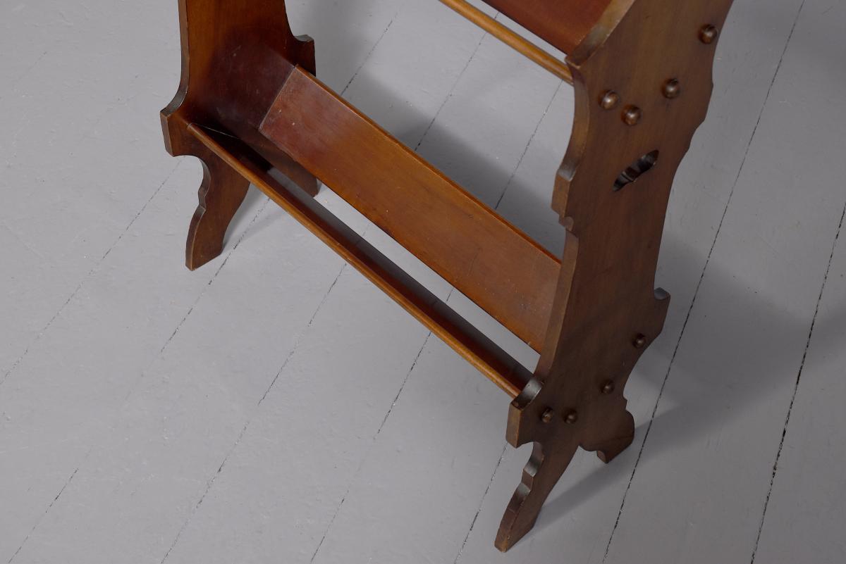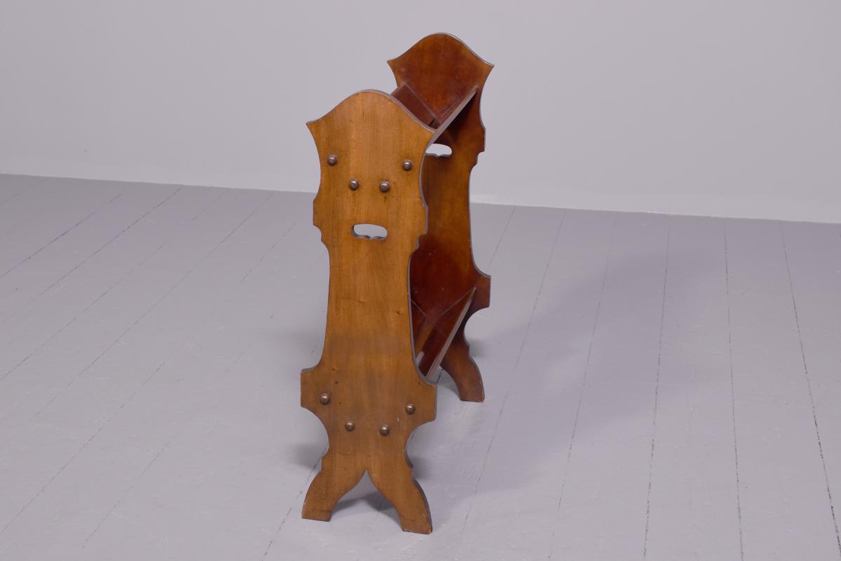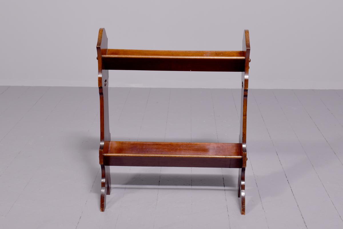 Circa 1900. Quality mahogany floor standing two tier bookrest, the solid shaped gables with pierced lifting handles to the sides, each with two sloping racks for holding the books, with the joints covered by mahogany rondels on the sides, finished on cut out fretted feet. Good colour and patination, clean and sturdy.