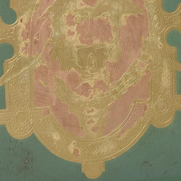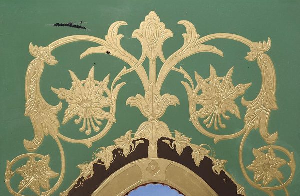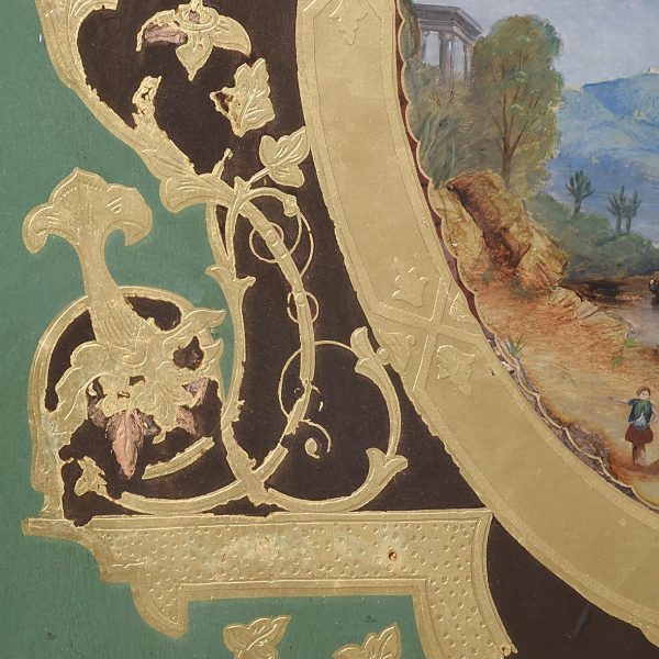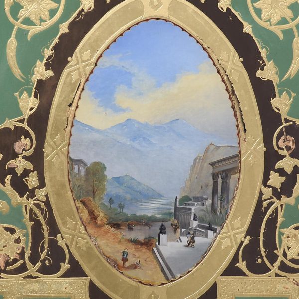 Circa 1880. A late Victorian framed, painted and etched glass panel framed in a stained frame with rectangular glass with a green background in the center, a beautiful oval gilded section painted with some classical buildings, people, mountains and lakes in the background, with further elaborate gilding and etching including vines and leaves. The bottom section with some staining behind the glass, with a large cartouche shaped section on the green background.