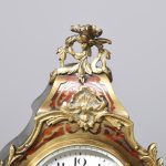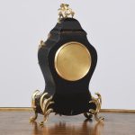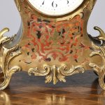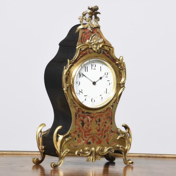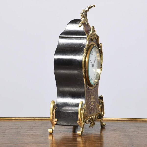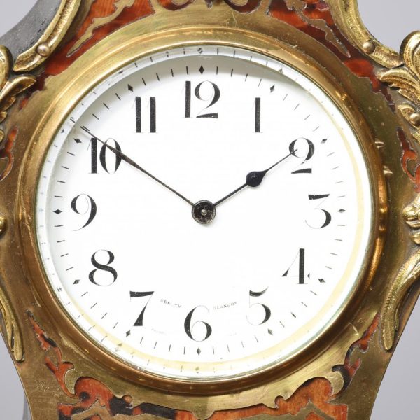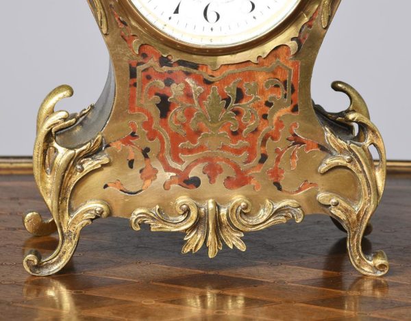 Circa 1900, a French Boulle mantel clock in Louis XV style, white enamel dial with Arabic numerals bearing the retailers name ‘Sorley of Glasgow’, all contained in a case of cartouche shape, with gilt brass scrolling, foliate mounts, resting on elegant cast cabriole legs.