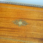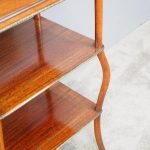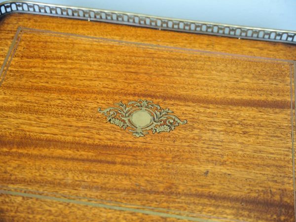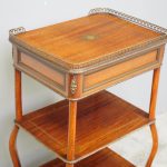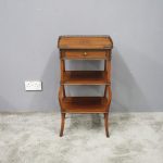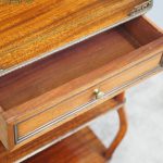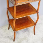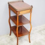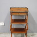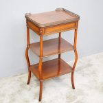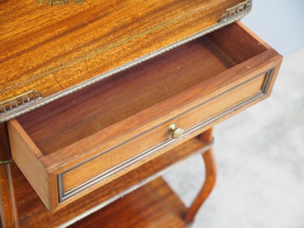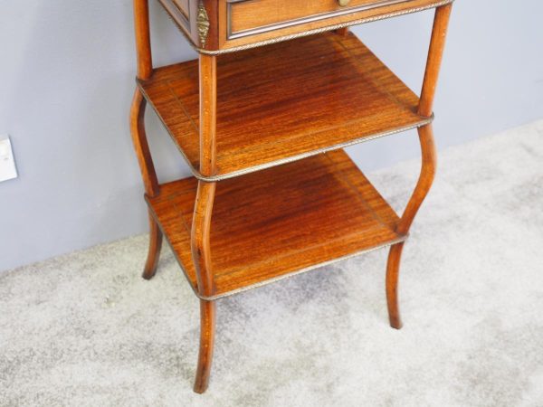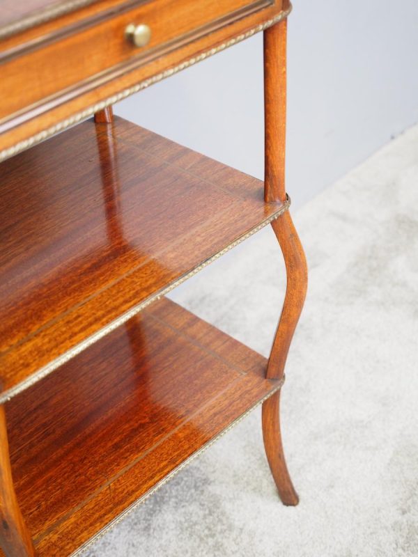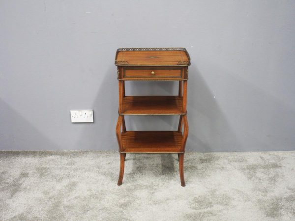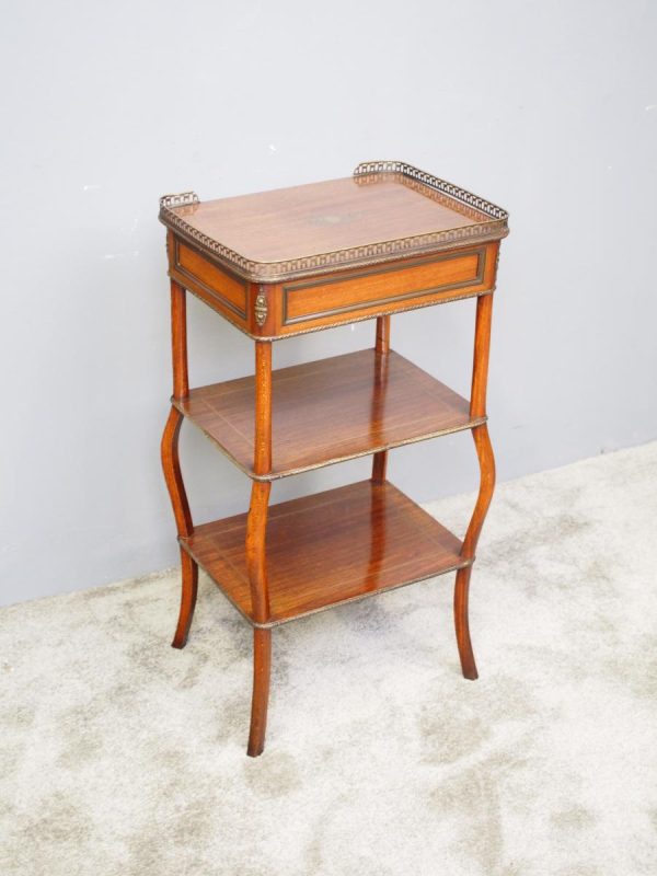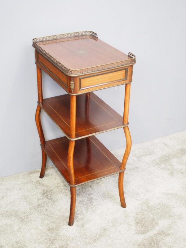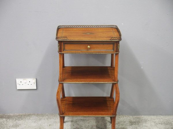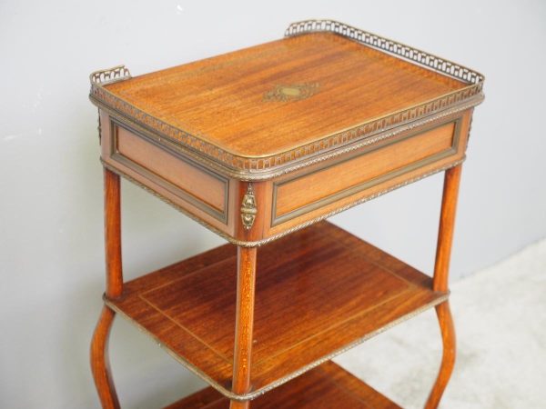 Circa 1920, neat sized French brass inlaid, 3-tier occasional table. The rectangular top with brass foliate and string inlay and three-quarter fretted gallery sits over a neat frieze drawer. There are two conforming brass inlaid tiers below and it is all on shaped supports.