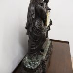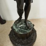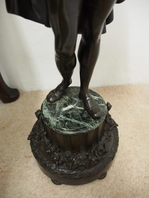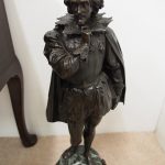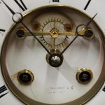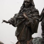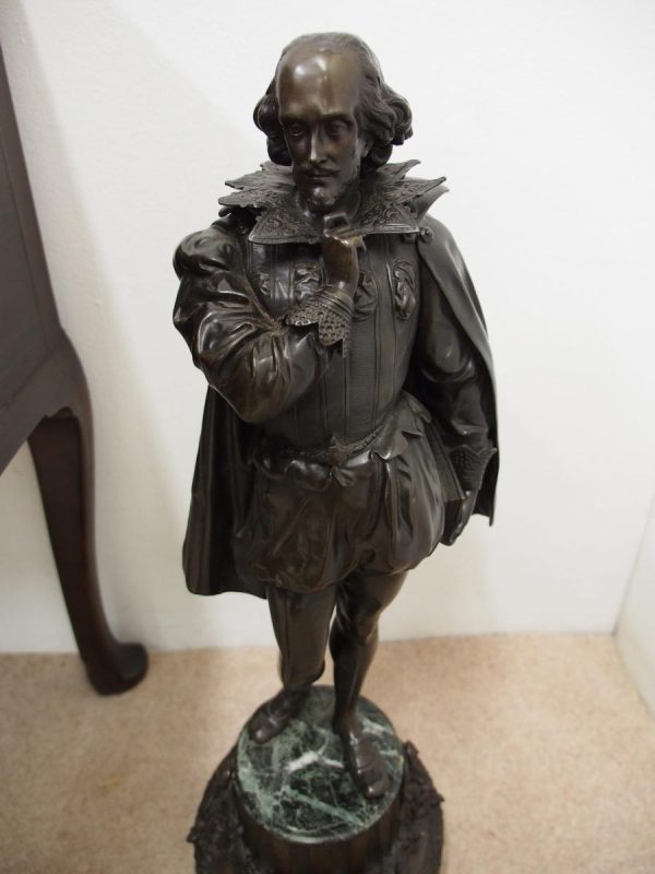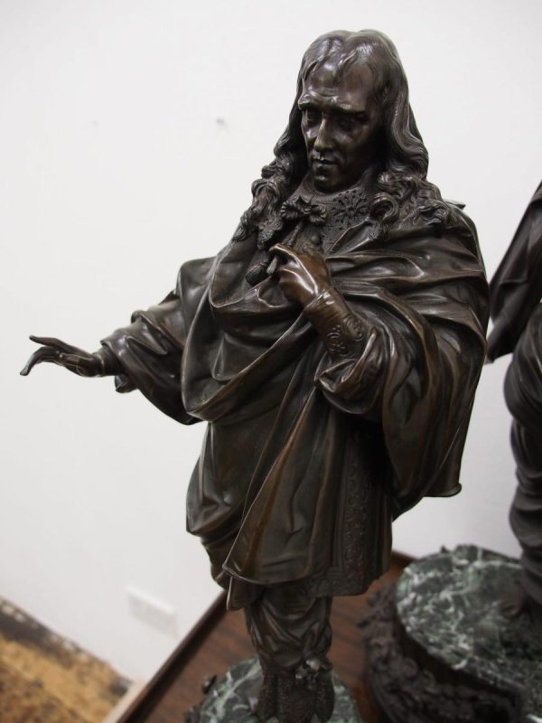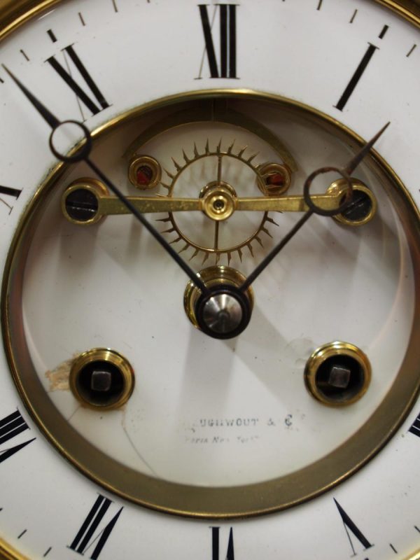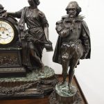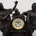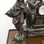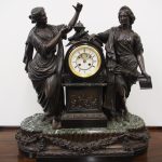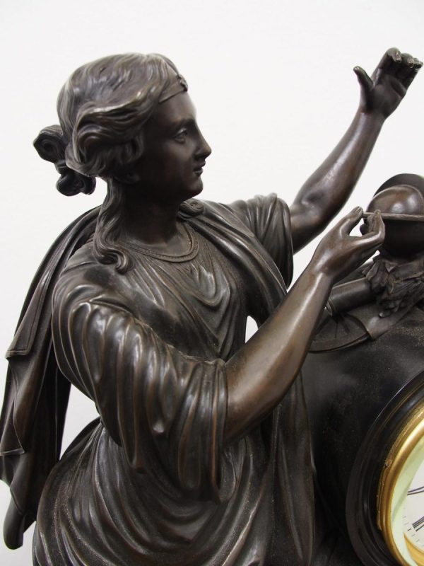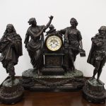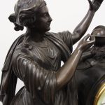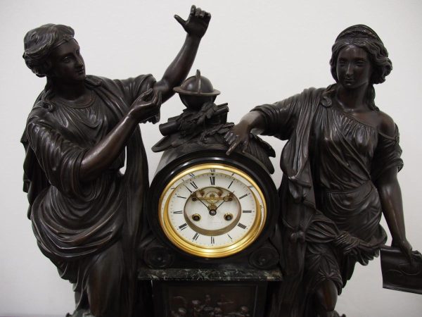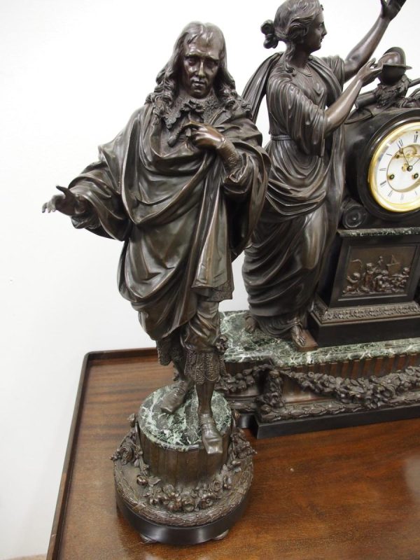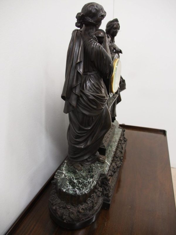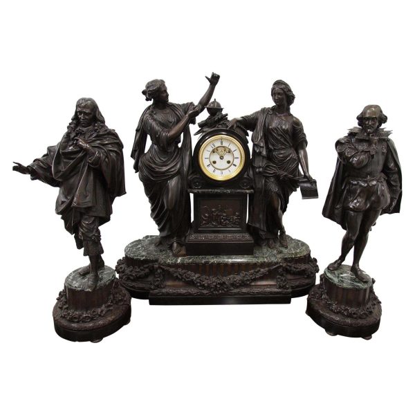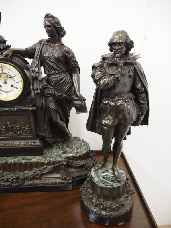 Circa 1860. A large French bronze and marble clock garniture emblematic of literature. The white enamel Roman number dial has an exposed escapement, set in a column surmounted by a trophy representing the arts, the clock is flanked by standing bronze figures of the muses Clio and Calliope, on a fluted oval green marble base with gilt metal mounts, raised on toupie feet, there are a pair of bronze figures of Shakespeare and Milton, on matching fluted marble bases, the eight day movement is stamped MF & F and striking a bell, the dial inscribed indistinctly ‘**UGHWOUT/ Paris New York’.