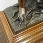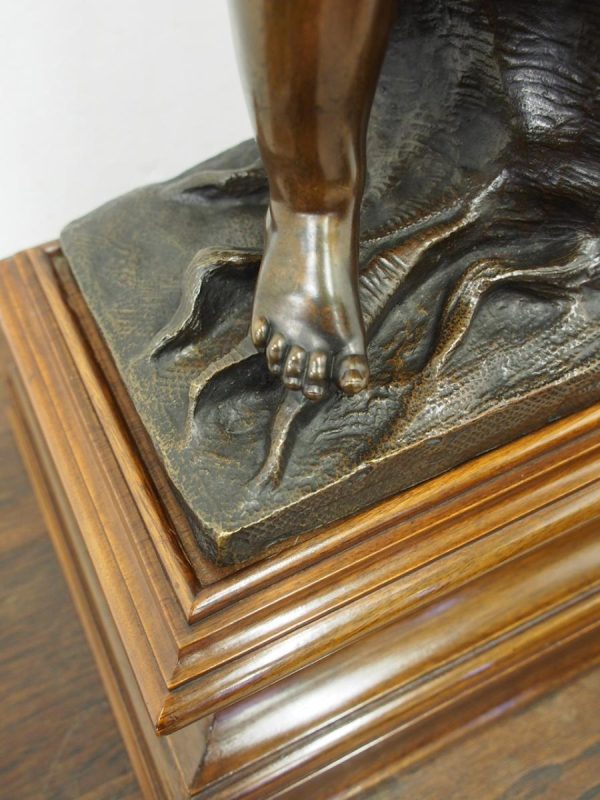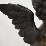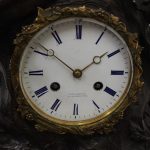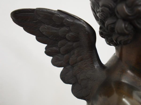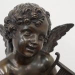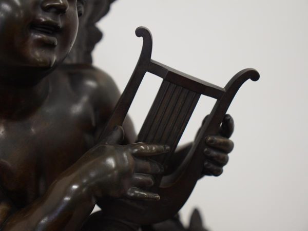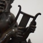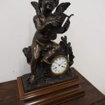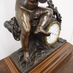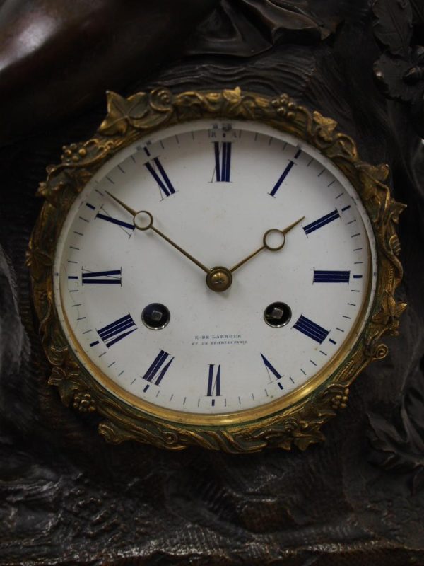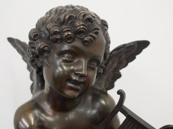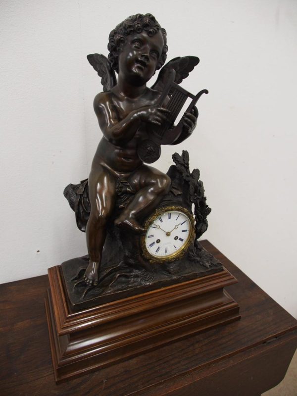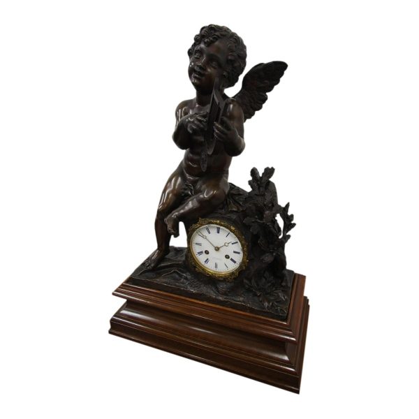 19th century, French bronze mantel clock inscribed with ‘E De Lanroque Ft. De Bronze Paris’. The 4 inch circular white enamel dial has Roman numerals, with the twin train movement stamped ‘De delaboue ft de bronzes à Paris’ within oval cartouche. The bronze case takes the form of a cherub with lyre on an outcrop, and it all sits on a moulded mahogany plinth.