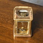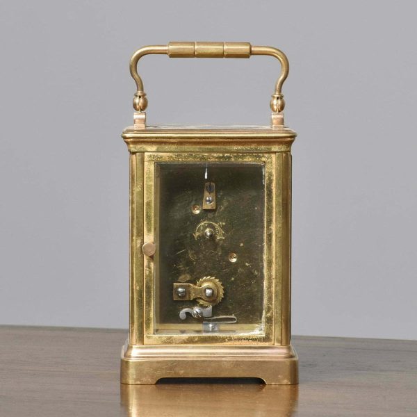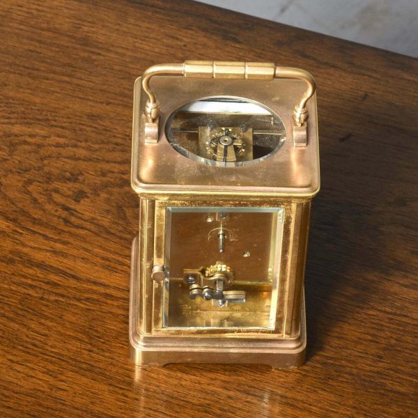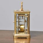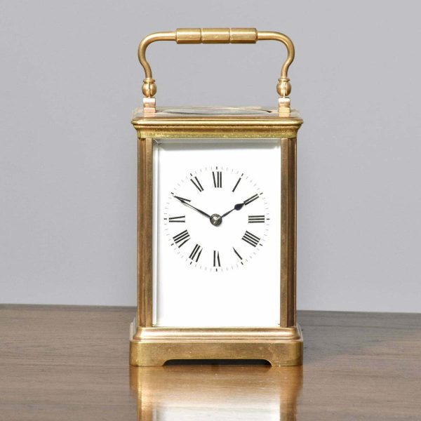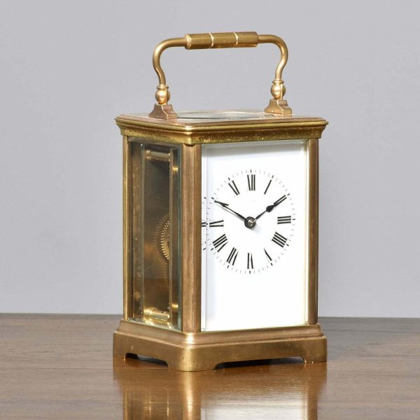 Circa 1970’s. A good quality cast brass French carriage clock. The rectangle shaped case with rounded corners, bevel edged glass on all sides with a door at the back, a lifting handle and glass aperture on the top for viewing the clock movement. With a white enamel face with Roman numerals and blue steel hands. Small stamp to the back plate Made in France. The neat sized clock has been serviced and is in working order.