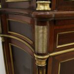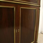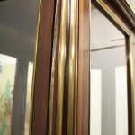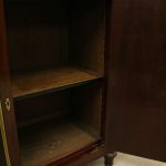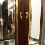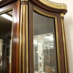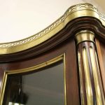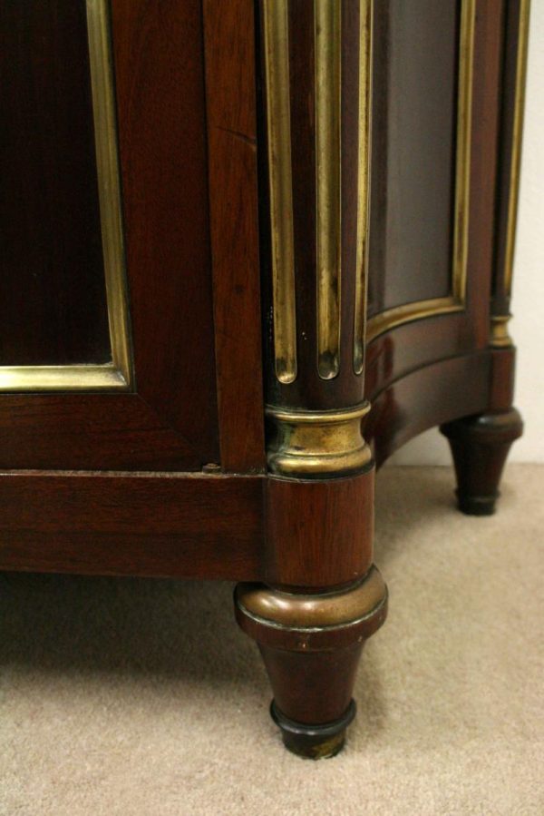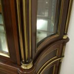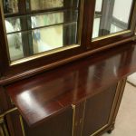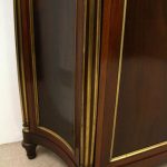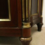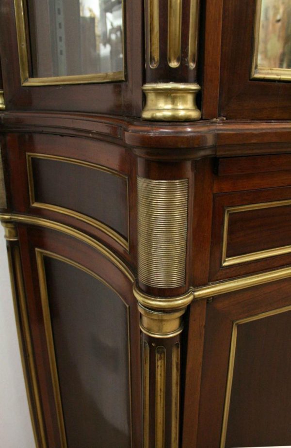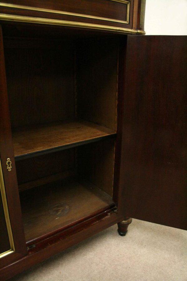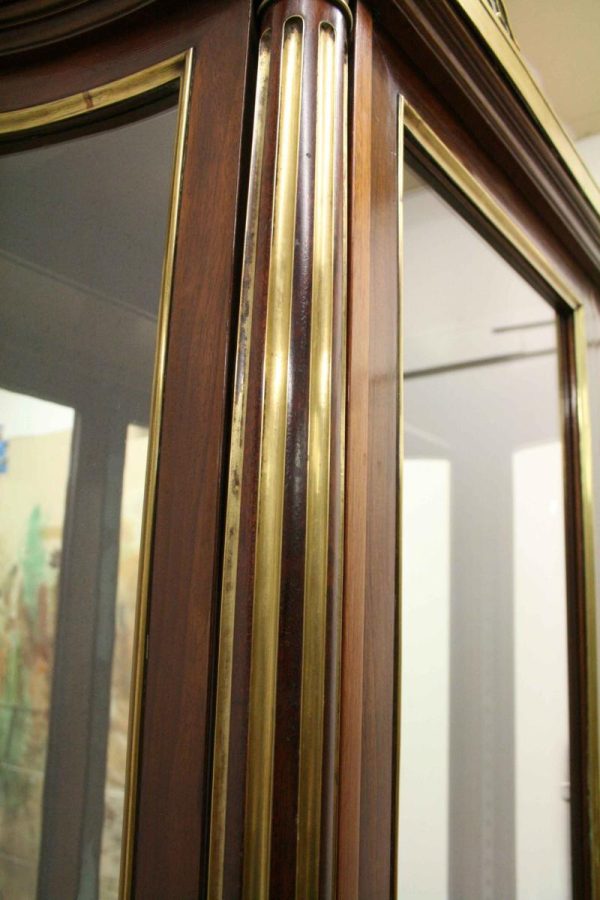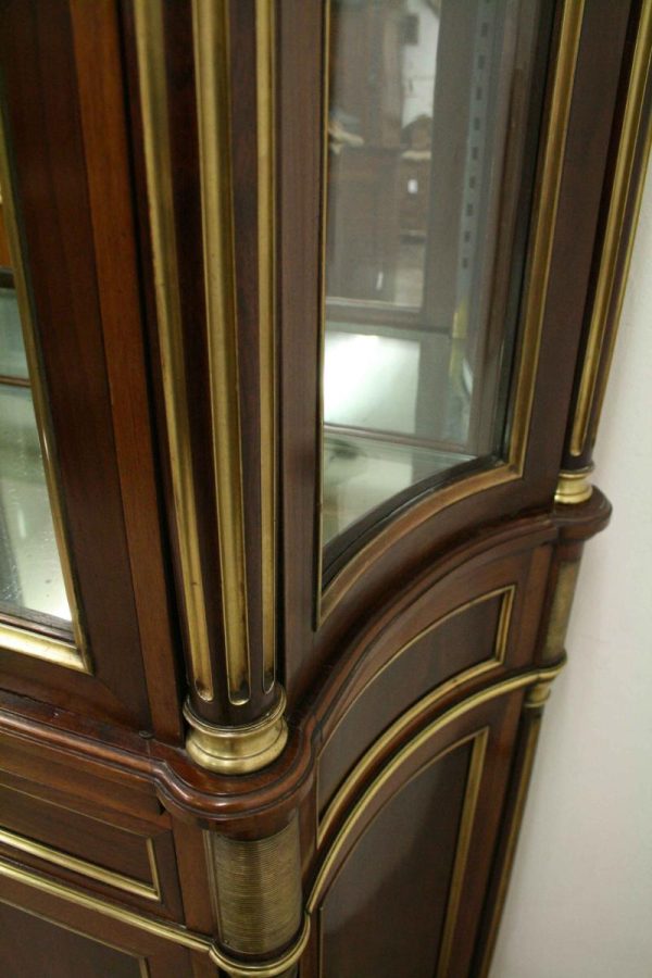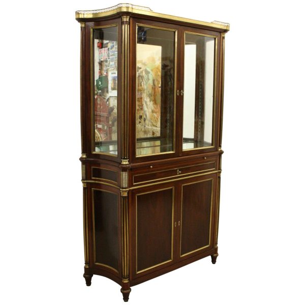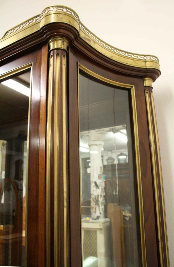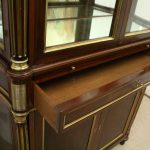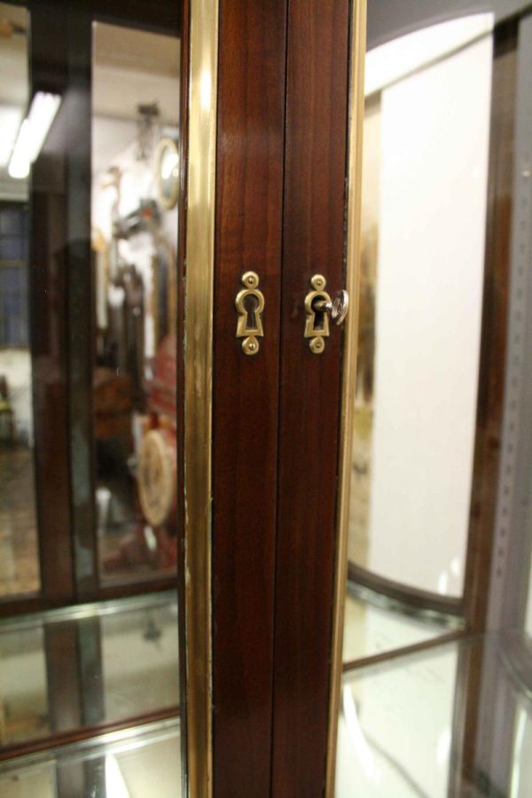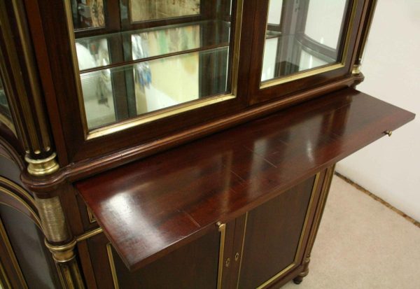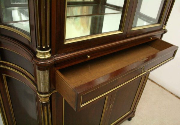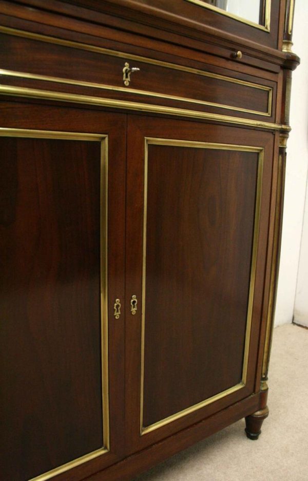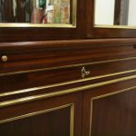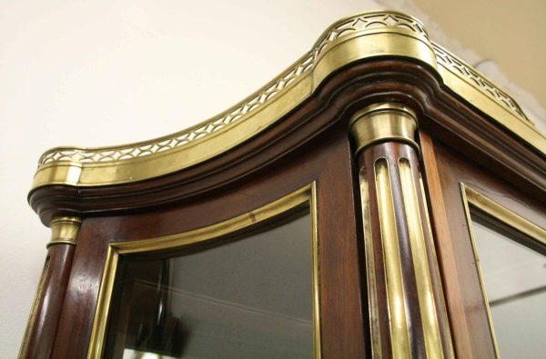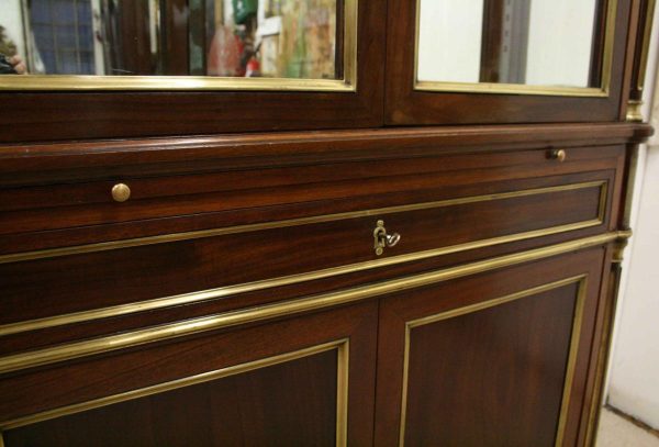 Circa 1900, French Empire style mahogany and brass inlaid display cabinet/bookcase, with a brass fretted gallery above the glazed doors and fluted brass inlaid pilasters. Inside there are shaped mirror shelves and a mirror back. The base section has fluted pilasters again, and a slide and long drawer over panelled doors to base.